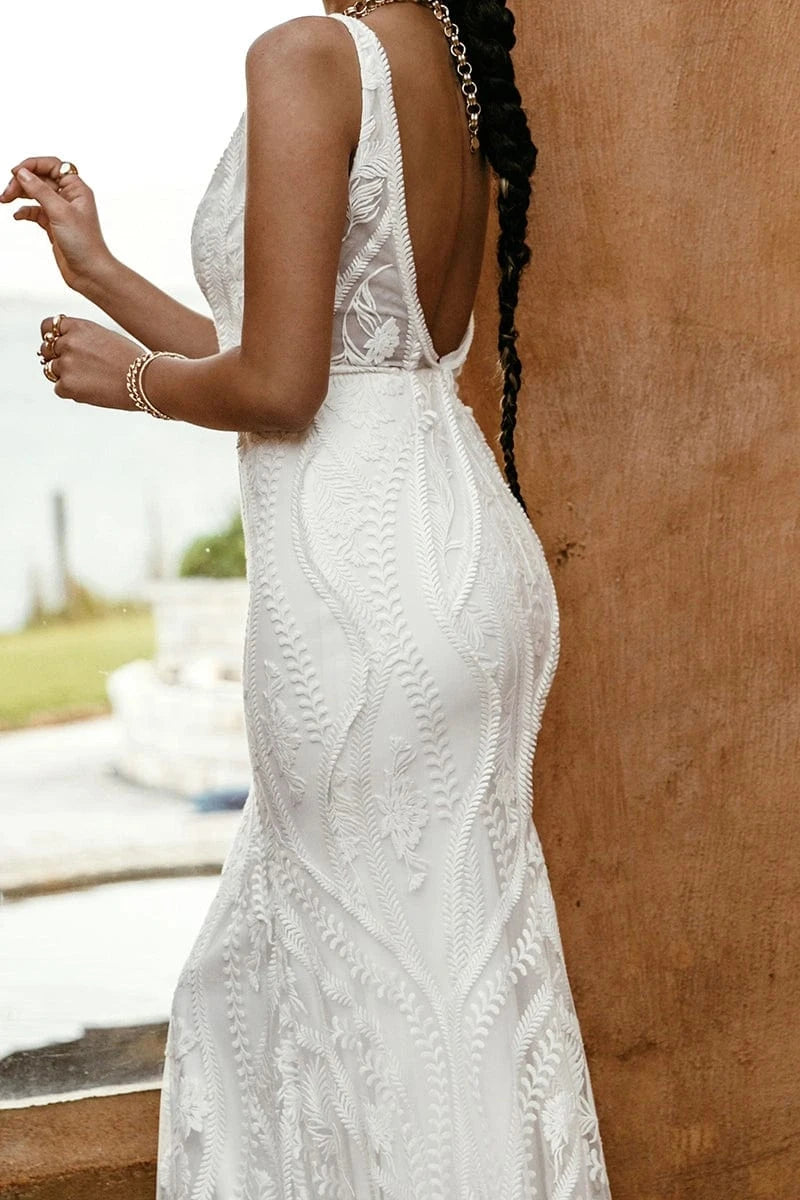 Lovers Society Hudson is a pretty lace fit and flare wedding dress featuring a deep V neckline! This gown comes to us in good condition from a designer boutique. There is minor pilling on the lining. Lovers Society Hudson is Off White in color and a size 10.