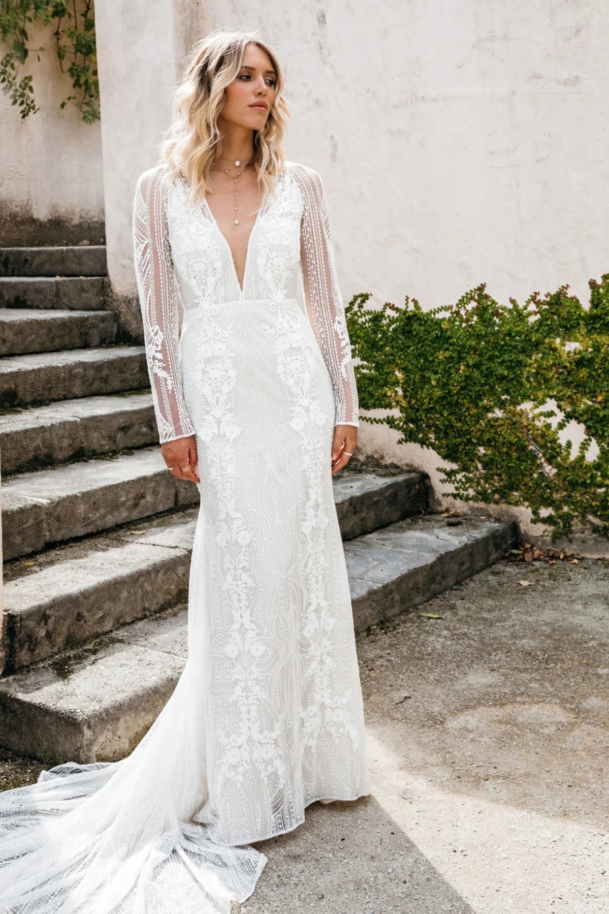Lovers Society Piper is a beautiful lace sheath wedding dress featuring a V neckline + detailed long sleeves! This gown comes to us in good condition from a designer boutique. There are spots on the front lace. Lovers Society Piper is Off White in color and a UK size 20, which fits like a US size 16.