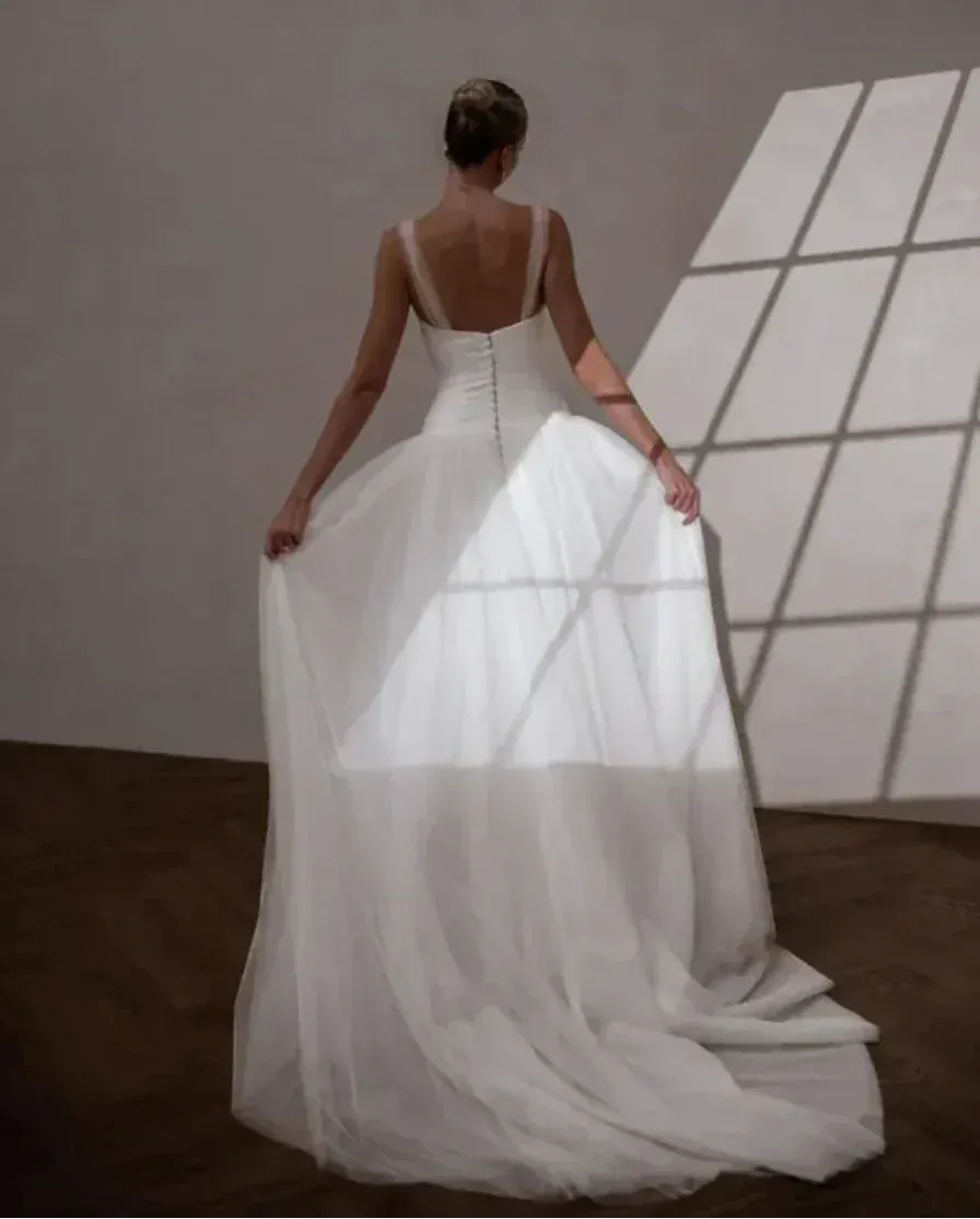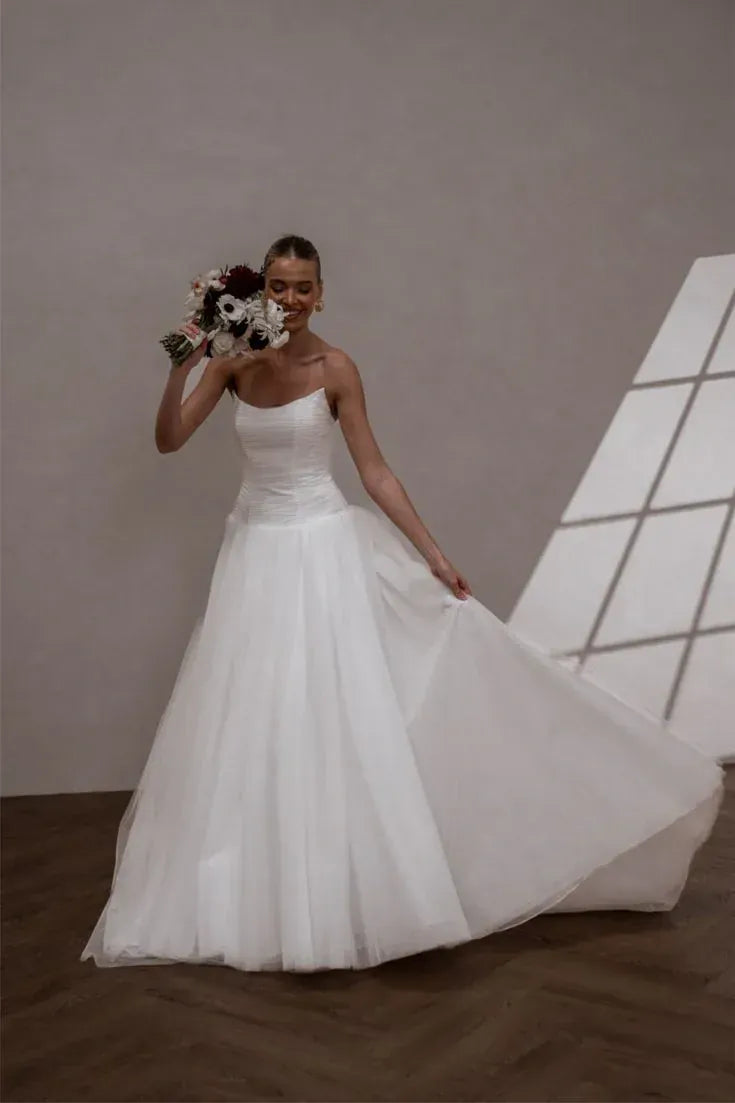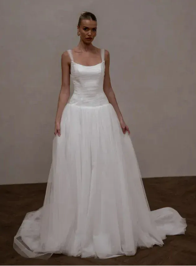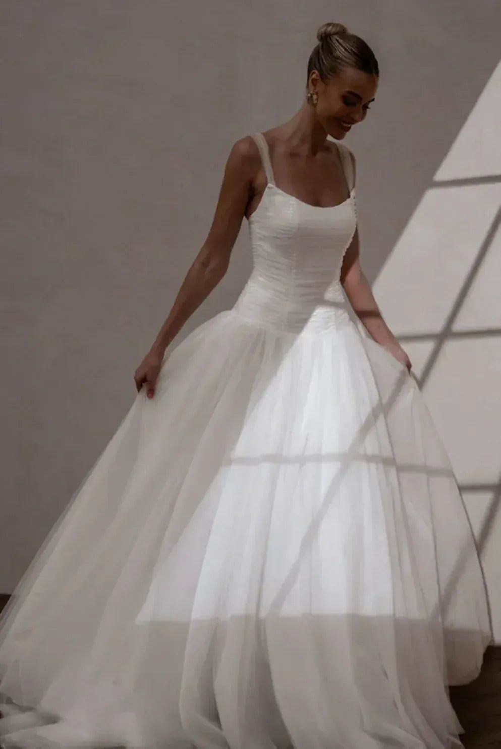 Made With Love Aire is a modern tulle A-line wedding dress with a drop waist and detachable tulle straps! This gown comes to us in great condition from a designer boutique. Made With Love Aire is Ivory in color and a size 12.