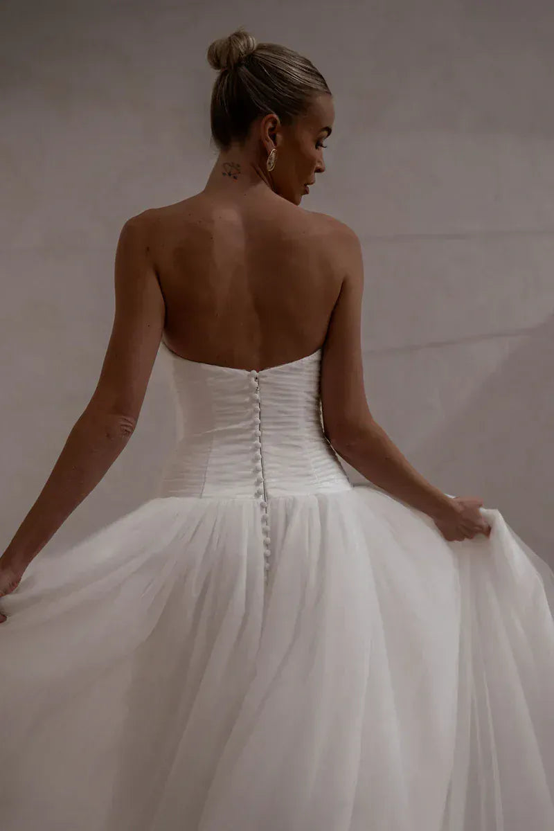 Our gowns haven't been worn down the aisle, but they may have been tried on by brides who chose a different dress. We hold our samples to high standards, though some may need a little extra love, like a loose button or a broken zipper - small fixes that a skilled seamstress can easily handle. Those minor imperfections mean major discounts! While we do our best to keep gowns in pristine condition, wear and tear can occur during try on. If you're interested in this style, please do not hesitate to text or email us for more details or additional photos before saying YES!