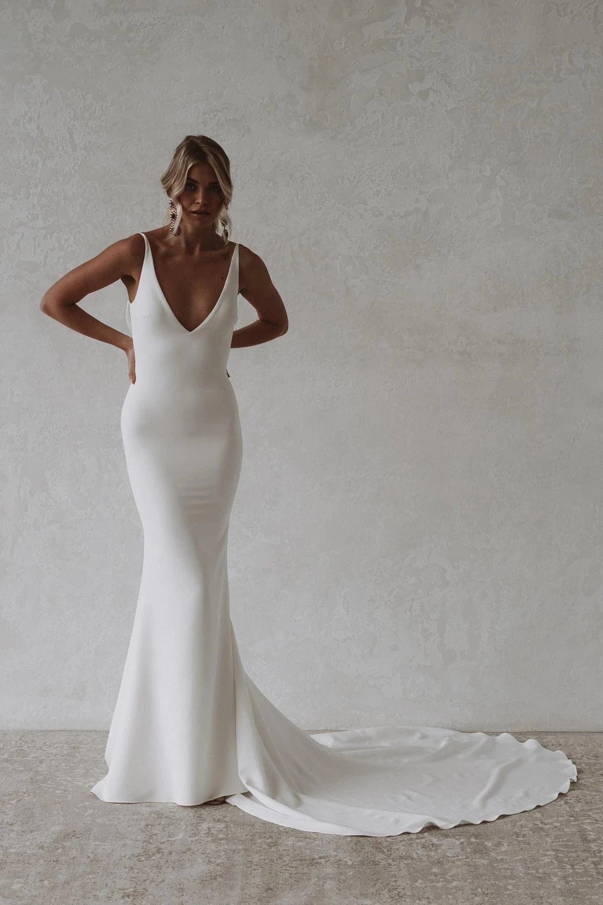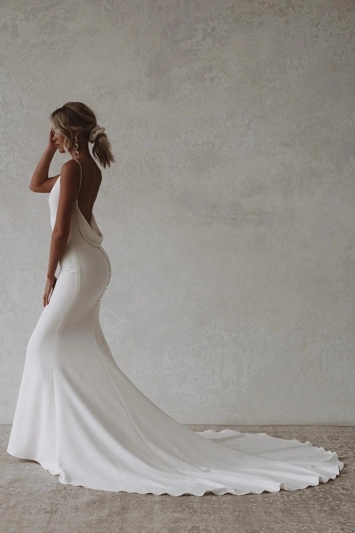 Made With Love Archie is a modern crepe sheath wedding dress featuring a V neckline + draped cowl back! This gown comes to us in great condition from a designer boutique. Made With Love Archie is Ivory in color and a size 4.
