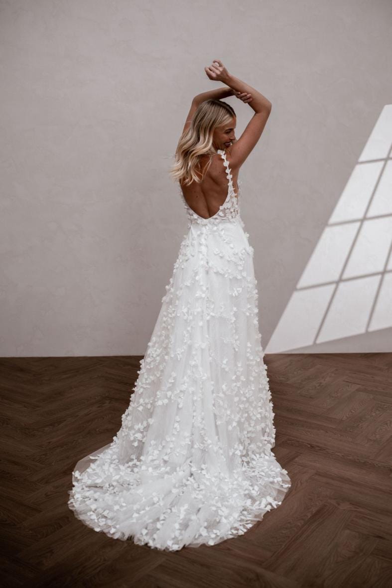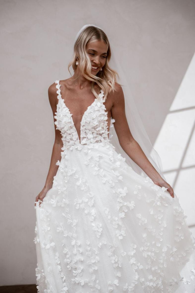 Made With Love Cooper Flowy is a dreamy lace A-line wedding dress featuring three-dimensional floral accents throughout! This gown comes to us in great condition from a designer boutique. Made With Love Cooper Flowy is Ivory in color and an Australian size 14, which fits like a US size 10.