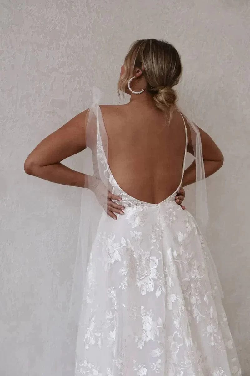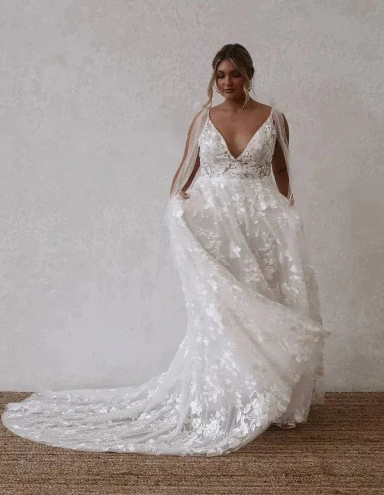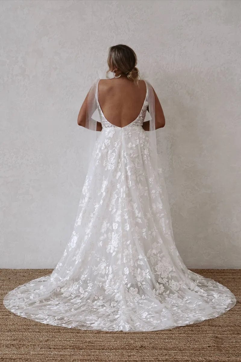 Made With Love Elsie is a stunning A-line wedding dress of floral lace! This timeless silhouette has a deep V neckline, thin straps, + long, flowy train. This gown comes to us in good condition from a designer boutique. There are spots on the lining. Made With Love Elsie is Ivory in color and a size 12.