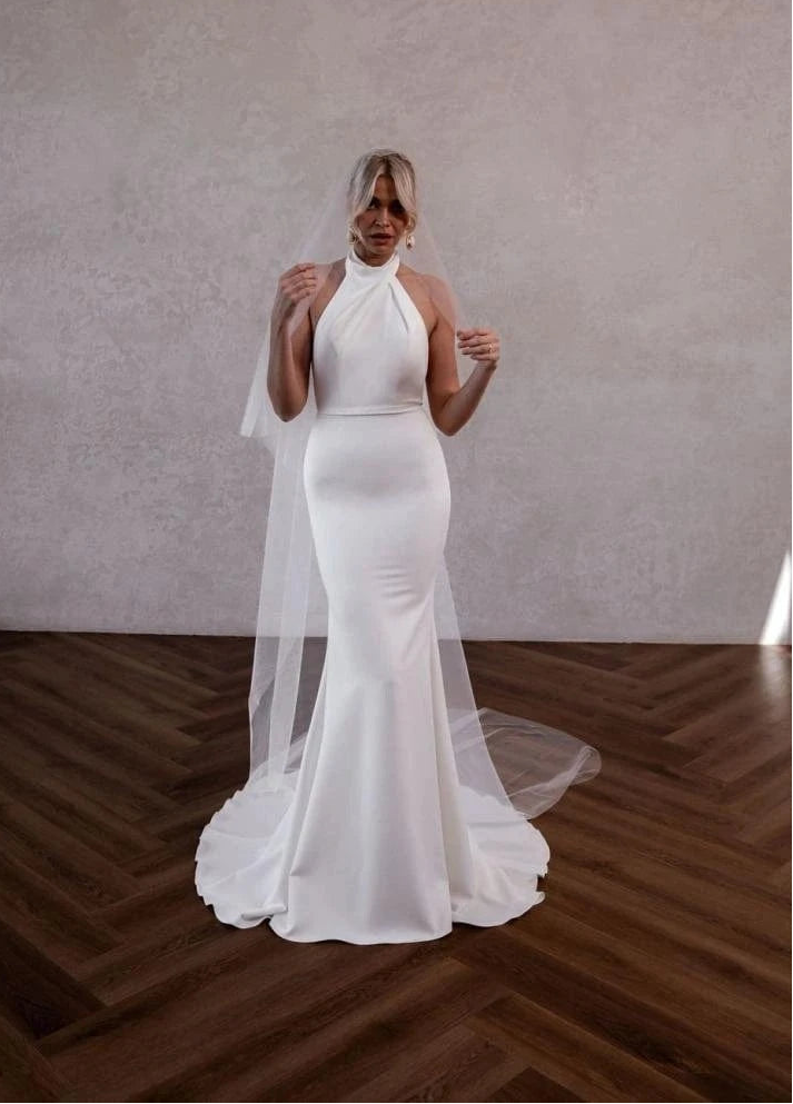 Made With Love Grayson is a gorgeous crepe fit and flare wedding dress featuring a halter neckline + short train! This gown comes to us in great condition from a designer boutique. Made With Love Grayson is Ivory in color and a split size 10/10/14.