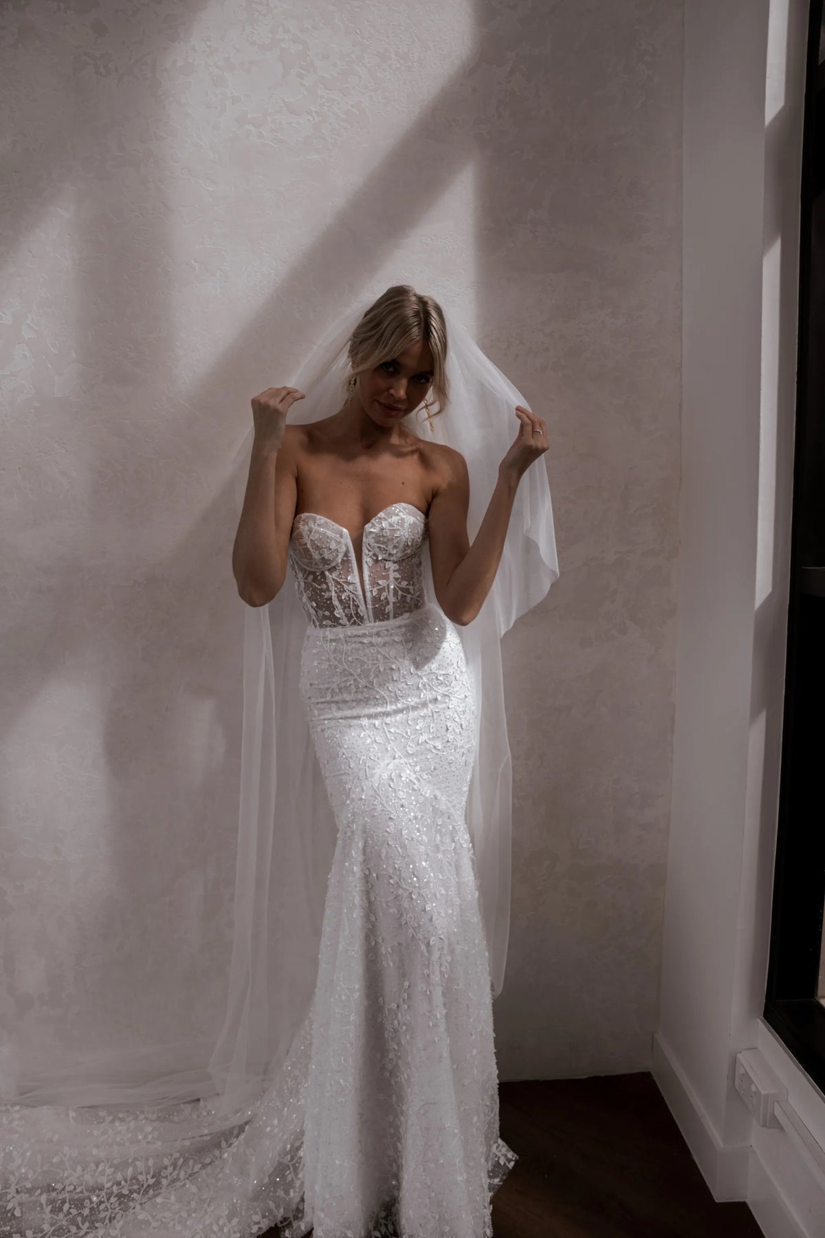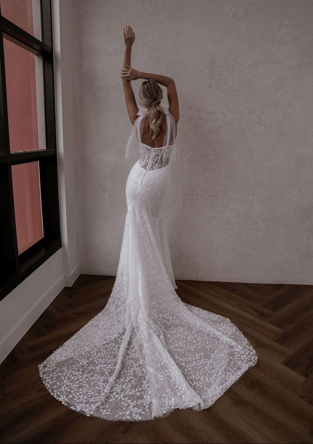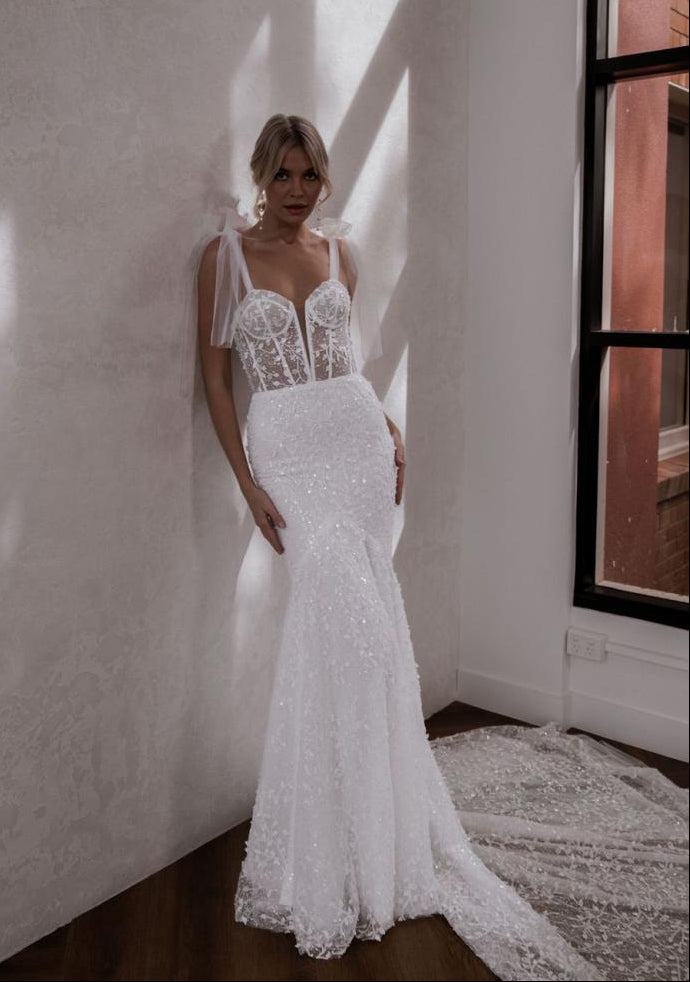 Made With Love Ollie is a sparkly beaded lace fit and flare wedding dress featuring a deep sweetheart neckline! This gown comes to us in great condition from a designer boutique. Made With Love Ollie is Ivory in color and an Australian size 14, which fits like a US size 10.