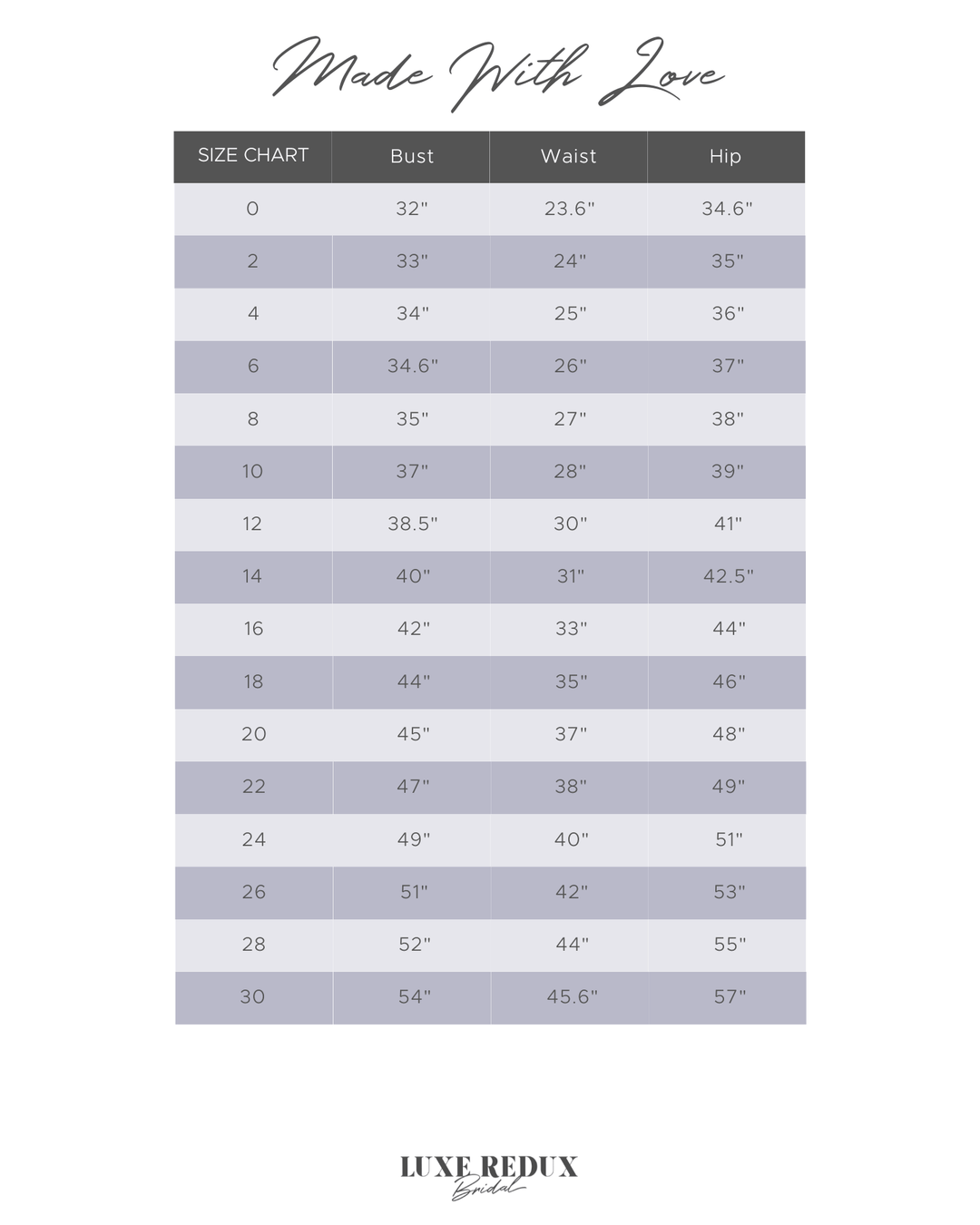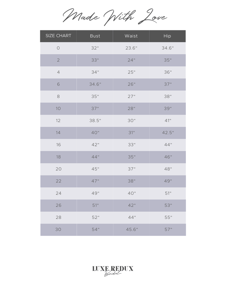 We encourage you to reach out to our stylists, or as we like to call them, your personal #hypesquad, to discuss measurements prior to placing your order. It’s easy! Email us at stylist@luxereduxbridal.com | Text us at 614.714.3818
