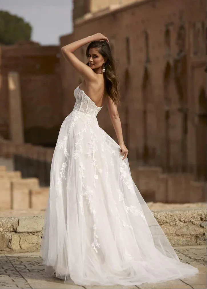 Madi Lane Adalyn is a romantic tulle + lace A-line wedding dress featuring a strapless sweetheart neckline! This gown comes to us in great condition from a designer boutique. Madi Lane Adalyn is Ivory/Latte in color and a size 12.