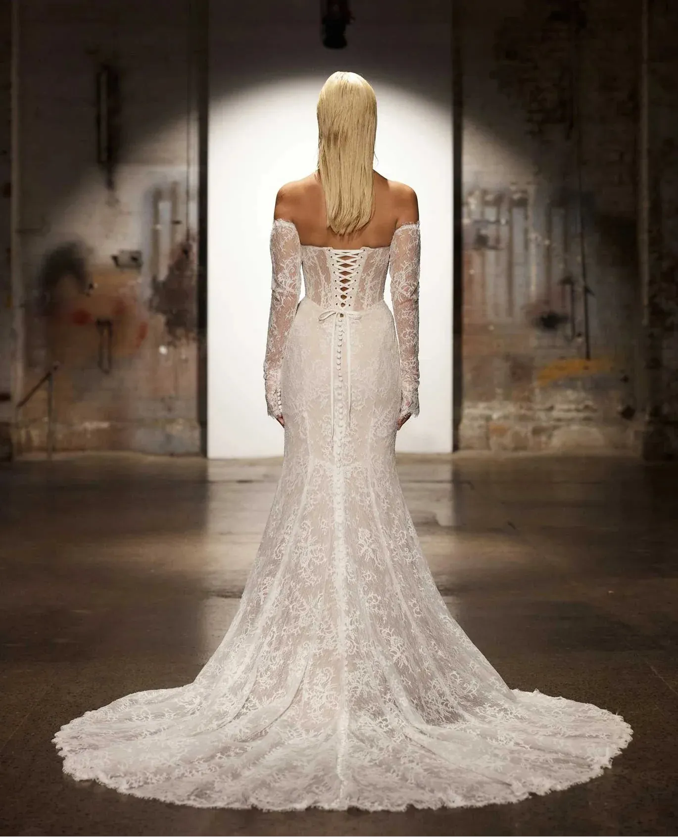 Madi Lane EY583 is a modern lace fit and flare wedding dress featuring a basque waist + detached long sleeves! This gown comes to us in great condition from a designer boutique. Madi Lane EY583 is Sand in color and a size 12.