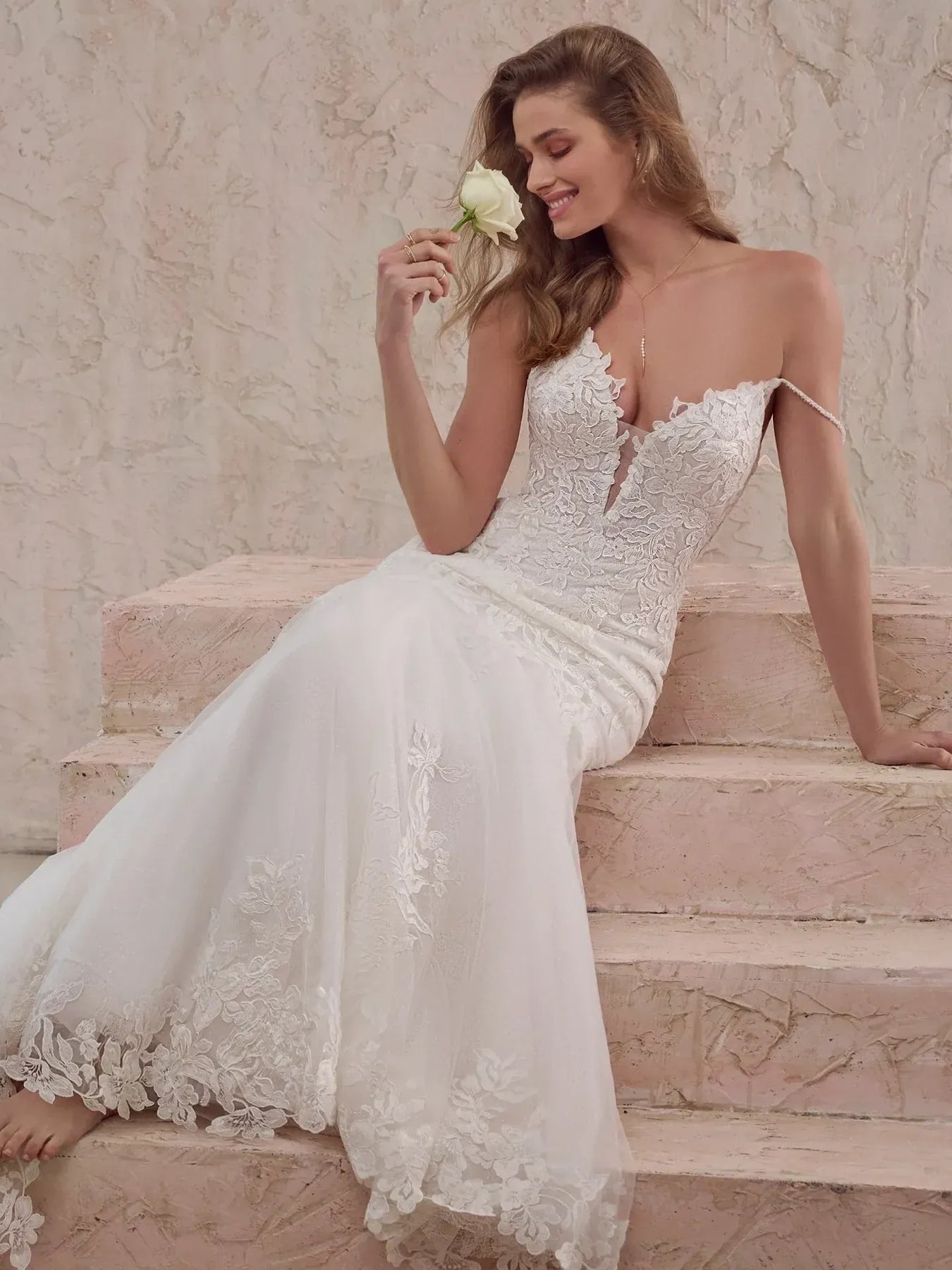 Maggie Sottero Penelope is a beautiful lace fit and flare wedding dress featuring a tulle skirt + lace accents on the train! This gown comes to us in good condition from a designer boutique. There are missing beads on a strap. Maggie Sottero Penelope is Ivory in color and a size 8.