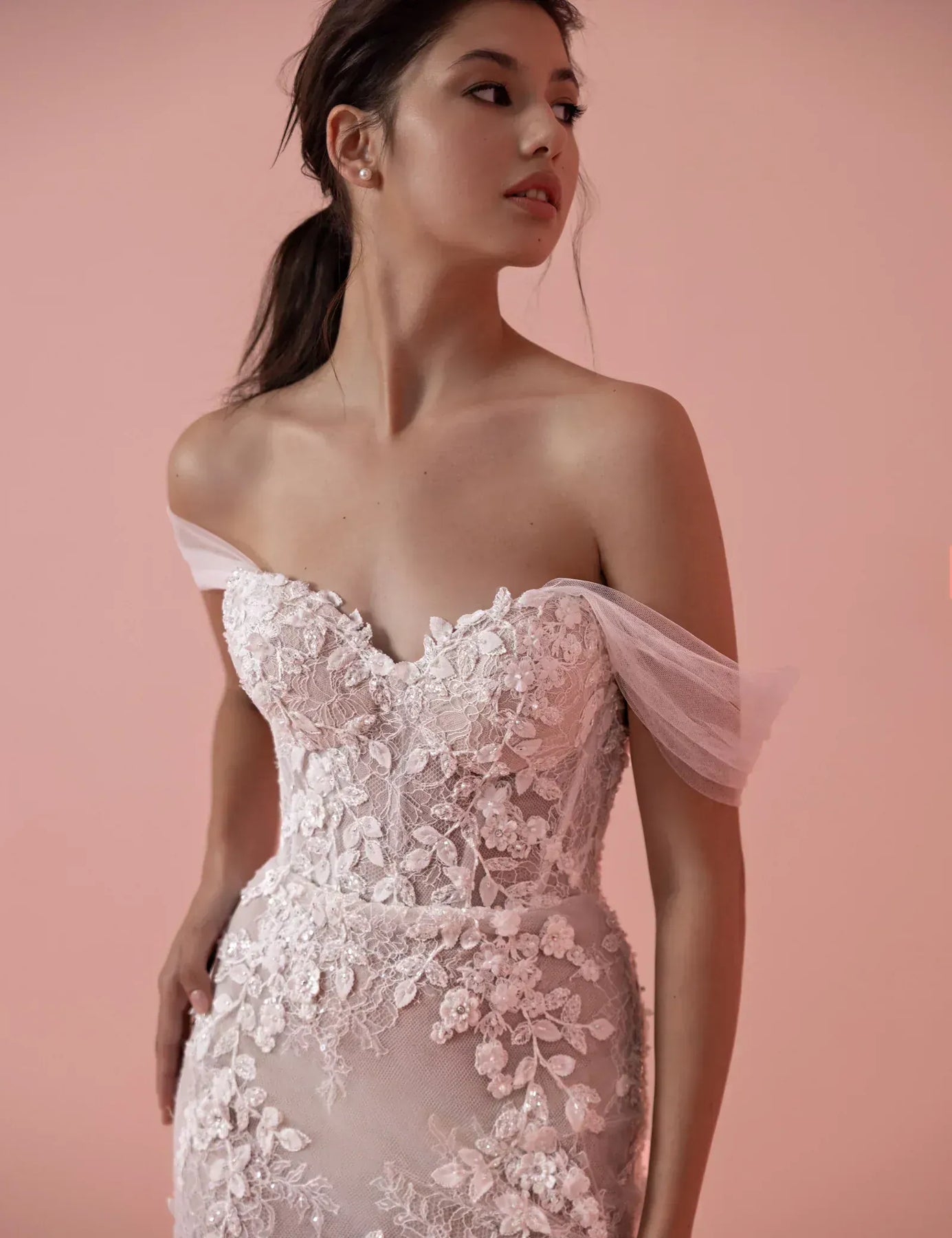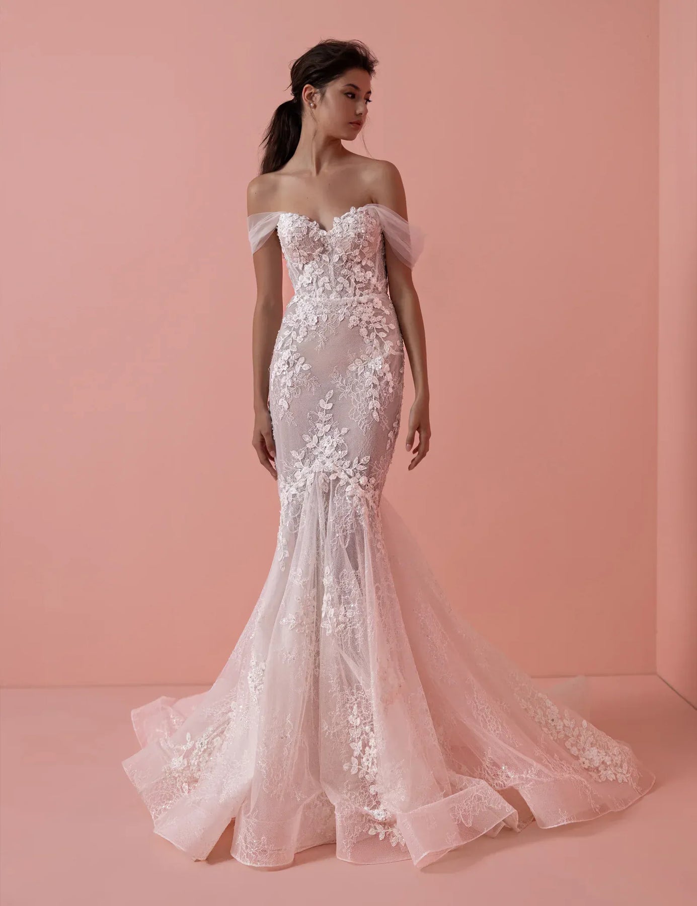 Maria Farbinni Pelargonio is a gorgeous tulle fit and flare wedding dress featuring floral lace details throughout this silhouette! This gown comes to us in great condition from a designer boutique. Maria Farbinni Pelargonio is Ivory/Beige in color and a size 6.
