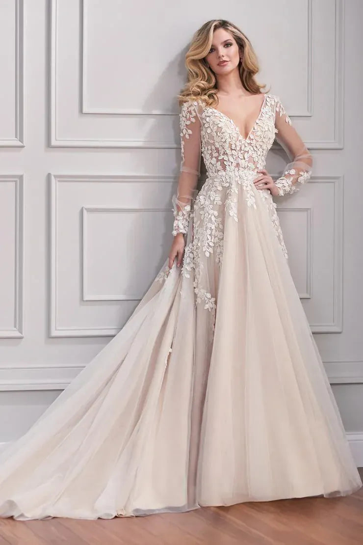Martin Thornburg Blaye 221203 is a charming tulle A-line wedding dress featuring floral motifs + long sleeves! This gown comes to us in great condition from a designer boutique. Martin Thornburg Blaye 221203 is Ivory/Champagne in color and a size 12.