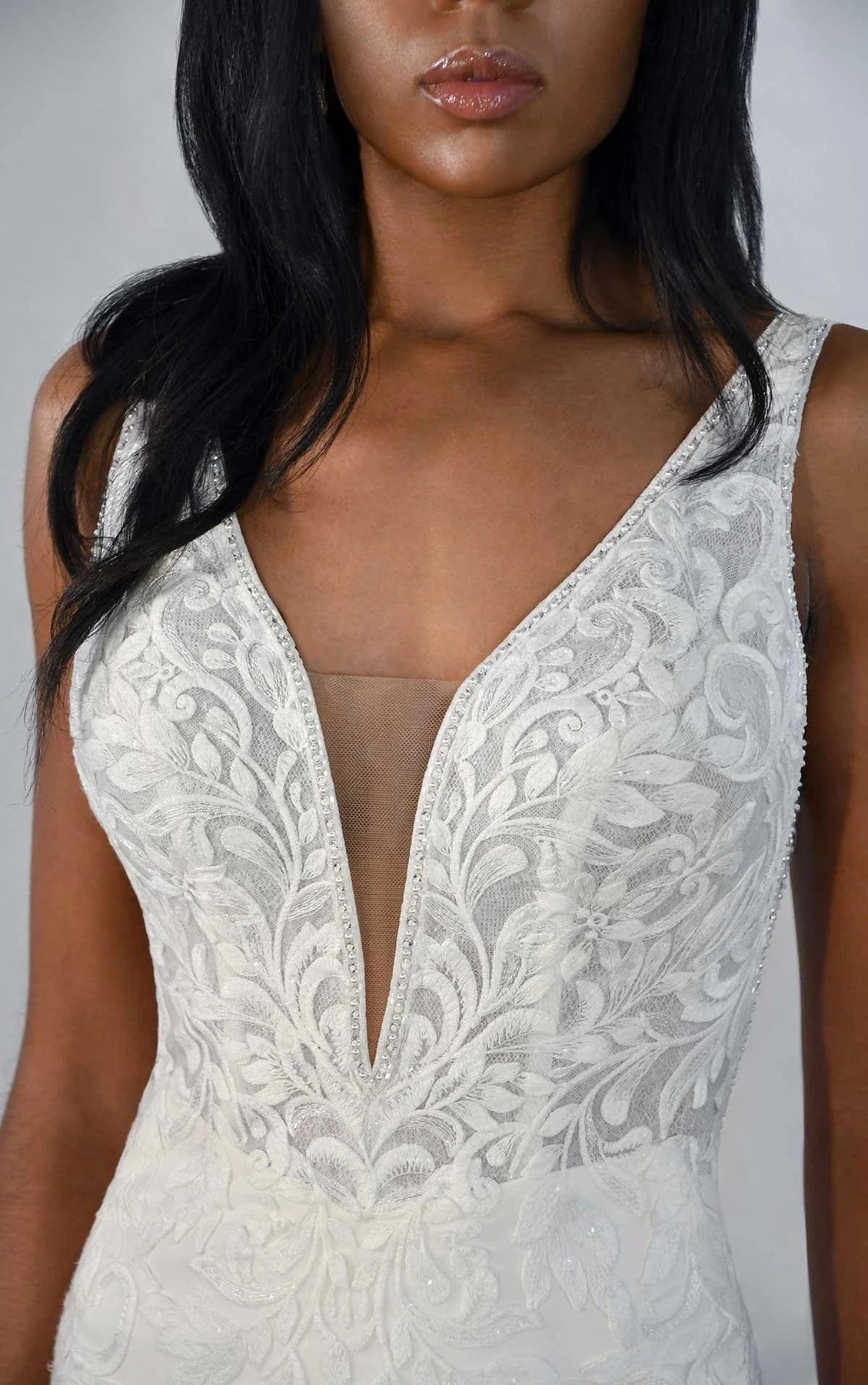 Martina Liana ML1381 is a chic crepe sheath wedding dress featuring subtle floral lace accents! The deep V neckline is the finishing touch to this silhouette. This gown comes to us in good condition from a designer boutique. Martina Liana ML1381 is Ivory/Porcelain in color and a size 20.