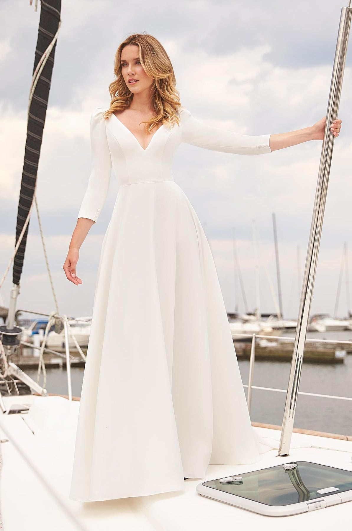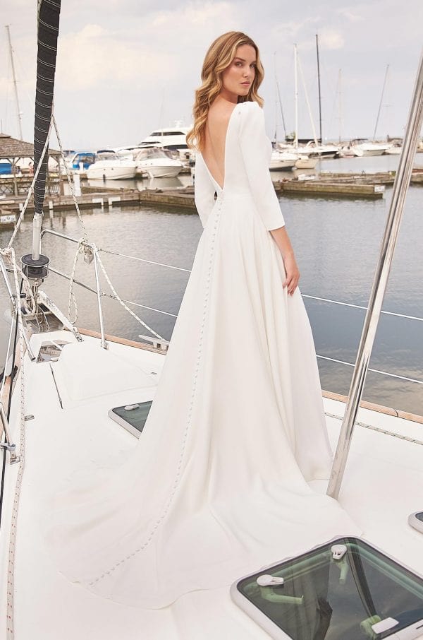 Mikaella 2381 is a modest crepe A-line wedding dress! Mid-length sleeves adorn the V neckline, while covered buttons line the back of the flowy skirt. This gown comes to us in good condition from a designer boutique. There are spots on some buttons. Mikaella 2381 is Natural in color and a size 10.