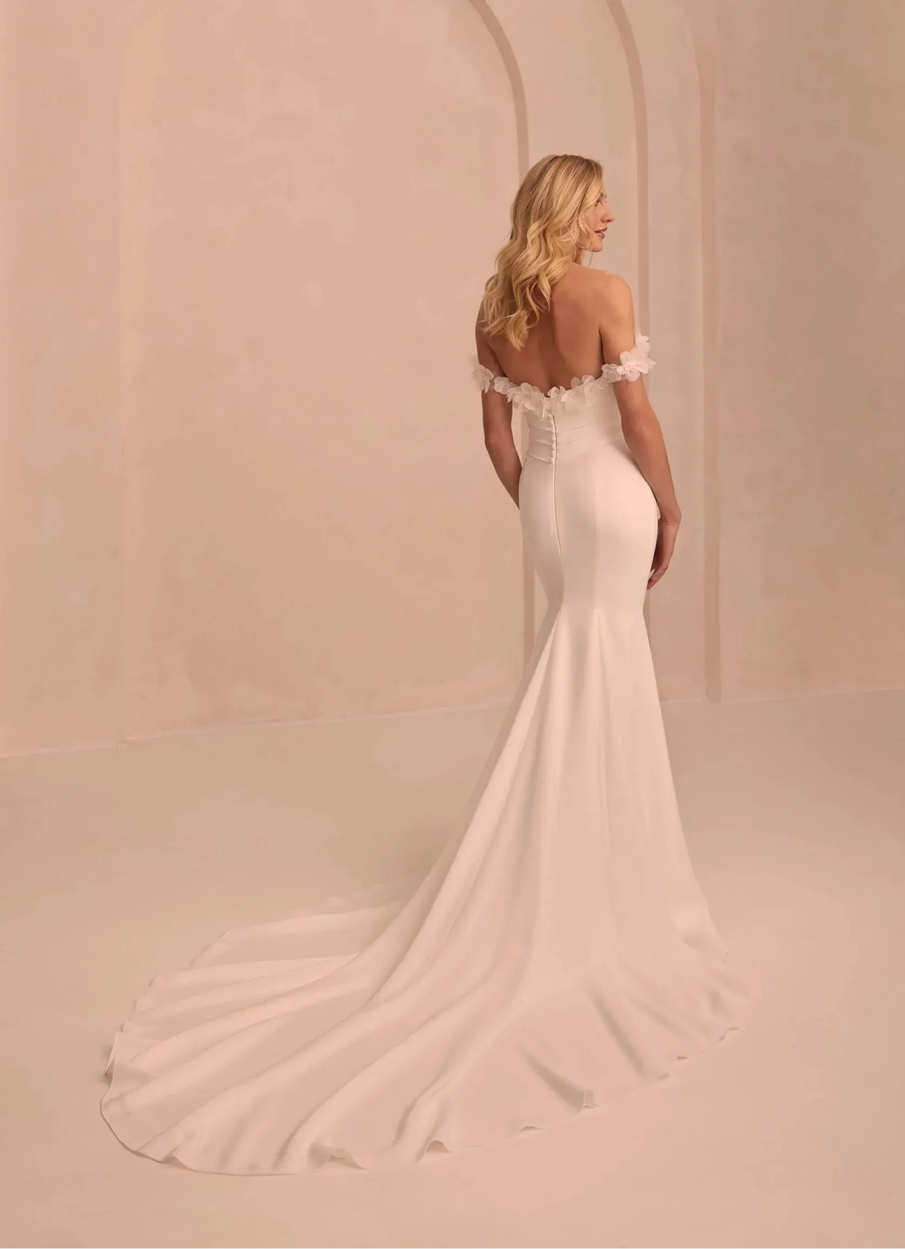 Mikaella M2502 is a stunning crepe fit and flare wedding dress featuring floral straps that add a pop of detail! This gown comes to us in great condition from a designer boutique. Mikaella M2502 is Natural in color and a size 10.