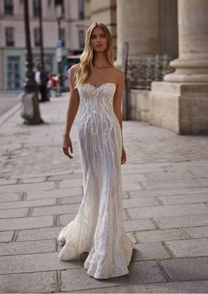 Milla Nova Nirvana is a sparkly beaded lace fit and flare wedding dress featuring a sweetheart neckline! Detachable straps are included. This gown comes to us in great condition from a designer boutique. There are a few missing beads on the straps. Milla Nova Nirvana is Ivory in color and a UK size 40, which fits like a US size 8.