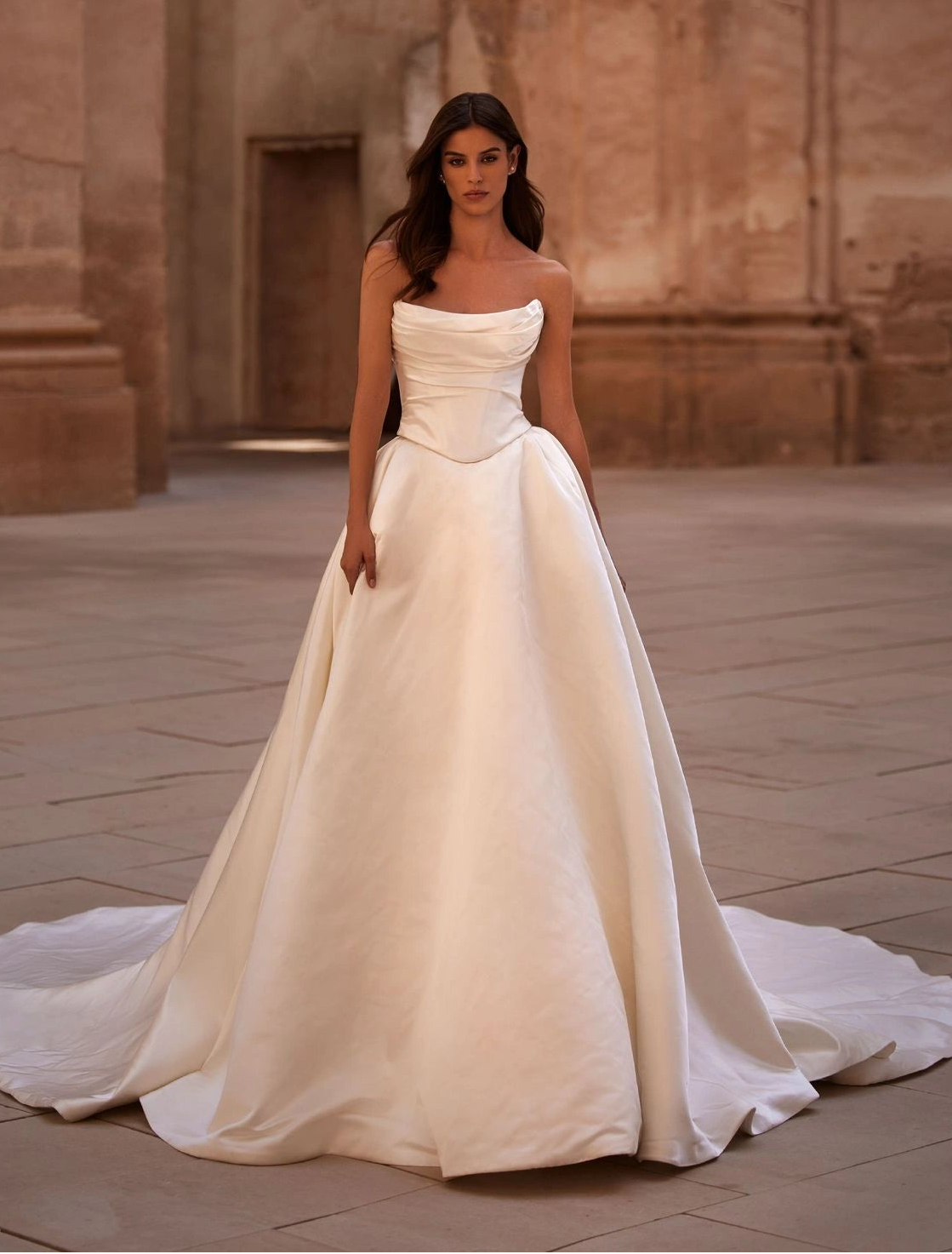 Milla Nova Satinelle is a luxurious mikado ball gown featuring a basque waist + scoop neckline! This gown comes to us in good condition from a designer boutique. There is a snag on the neckline, + a small spot near the zipper. Milla Nova Satinelle is Ivory in color and a UK size 50, which fits like a US size 18.