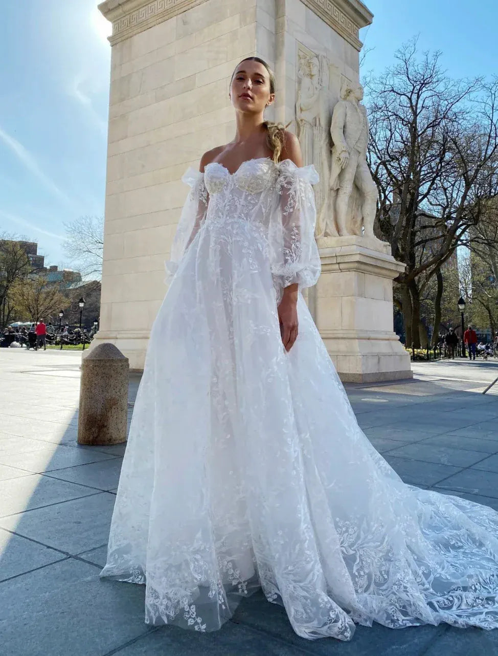 Our gowns haven't been worn down the aisle, but they may have been tried on by brides who chose a different dress. We hold our samples to high standards, though some may need a little extra love, like a loose button or a broken zipper - small fixes that a skilled seamstress can easily handle. Those minor imperfections mean major discounts! While we do our best to keep gowns in pristine condition, wear and tear can occur during try on. If you're interested in this style, please do not hesitate to text or email us for more details or additional photos before saying YES!