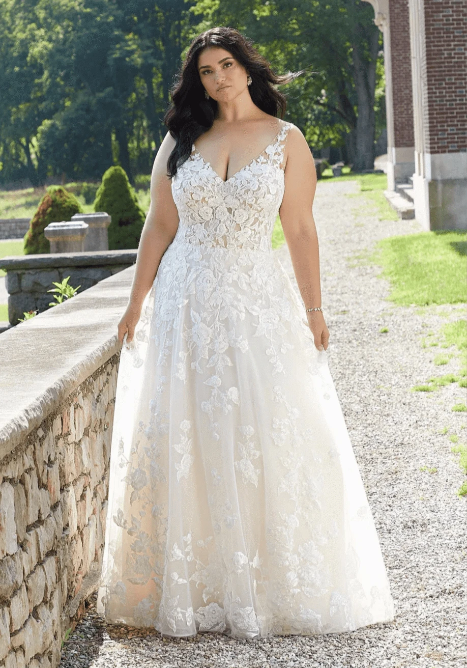 Morilee 3349 is a gorgeous lace A-line wedding dress featuring a V neckline + floral appliqués! This gown comes to us in good condition from a designer boutique. There are loose threads/beads. Morilee 3349 is Ivory/Porcelain in color and a size 22W.