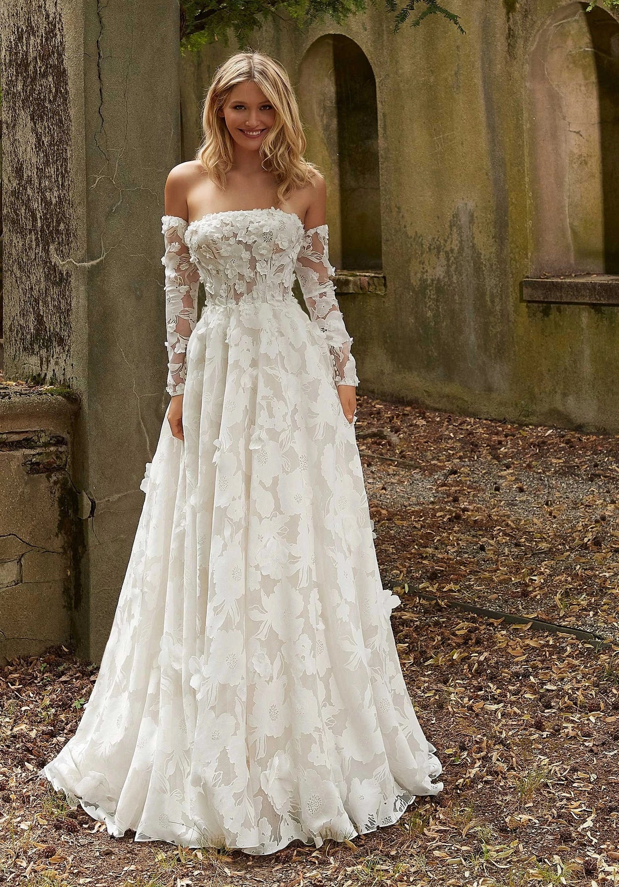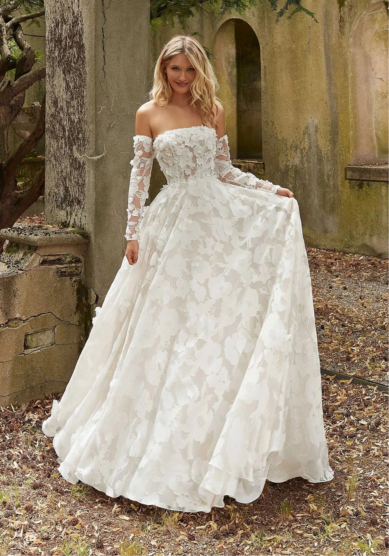 Morilee Poppy is a dreamy burnout organza A-line wedding dress featuring a floral design + detachable long sleeves! This gown comes to us in great condition from a designer boutique. Morilee Poppy is Ivory in color and a size 8.