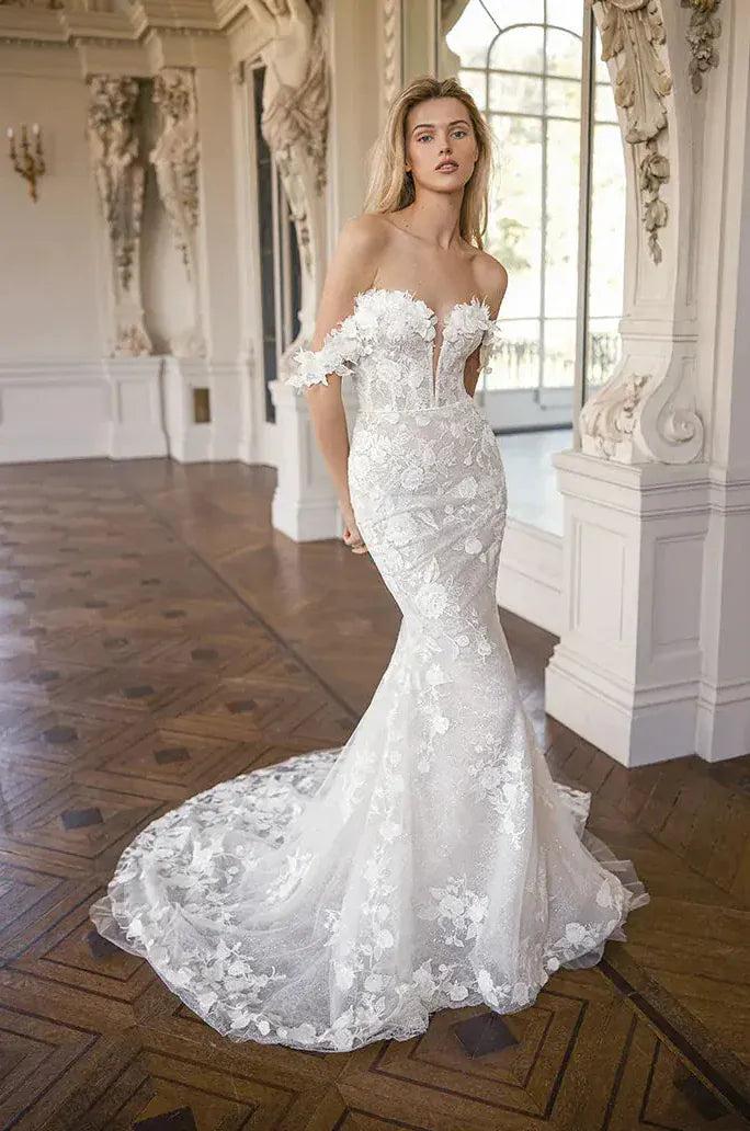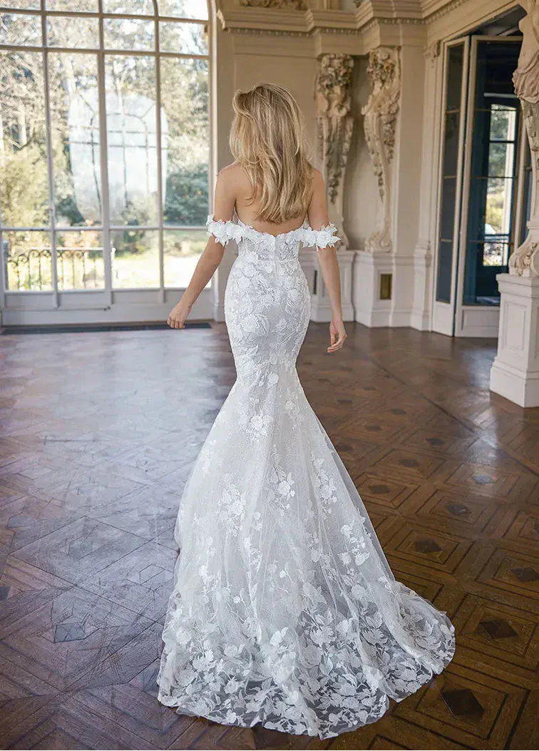 Netta BenShabu Darlene is a stunning lace fit and flare wedding dress featuring dimensional floral straps! This gown comes to us in great condition from a designer boutique. Note, this designer tends to run small. Netta BenShabu Darlene is Ivory in color and a European size 44, which fits like a US size 18.