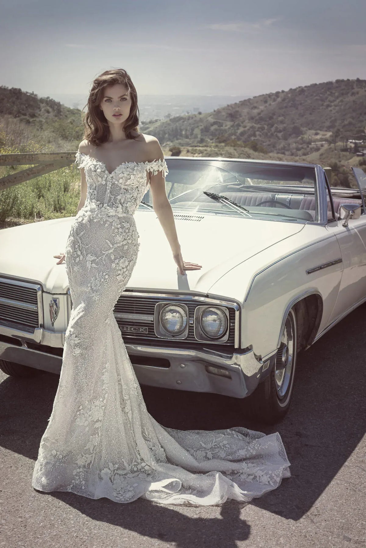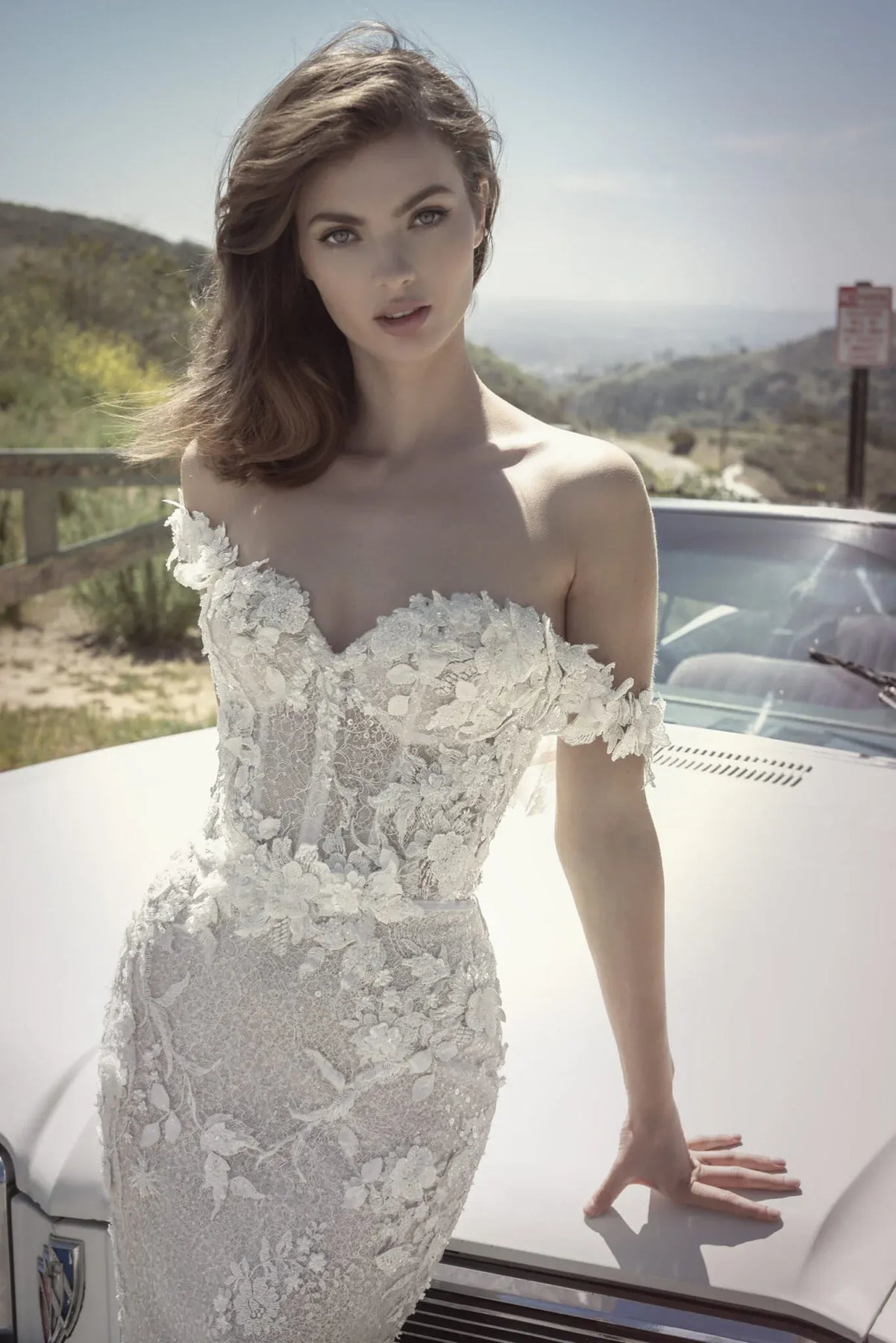 Netta BenShabu Cavin is a luxurious lace fit and flare wedding dress featuring layered laces + dimensional accents! Please note, this designer runs small. This gown comes to us in great condition from a designer boutique. The hook/eye are chipped. Netta BenShabu Cavin is Ivory in color and a European size 42T, which fits like a US size 16.
