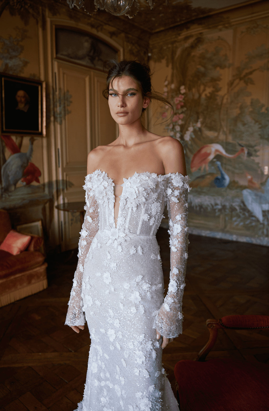 Netta BenShabu Emerson is the dreamiest lace fit and flare wedding dress featuring dimensional floral accents + long sleeves! This gown comes to us in good condition from a designer boutique. There are loose threads/pilling, + spots on the lining. Note, this designer tends to run small. Netta BenShabu Emerson is Ivory in color and a European size 42T, which fits like a US size 16.