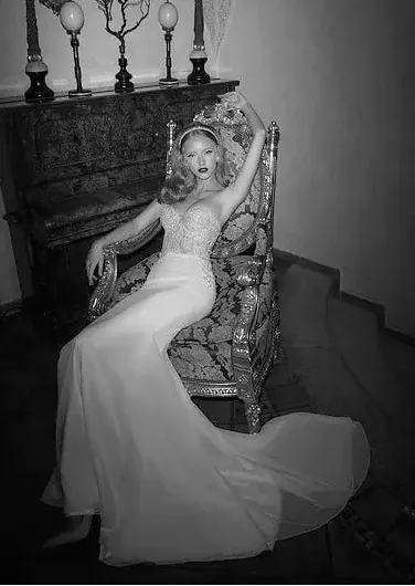 Netta BenShabu Kirra is a beautiful chiffon fit and flare wedding dress featuring beaded embroidery on the strapless bodice! Please note, this designer runs small. This gown comes to us in good condition from a designer boutique. There are spots on the hem + pin marks on the lining. Netta BenShabu Kirra is Ivory/Nude in color and a European size 38, which fits like a US size 12.