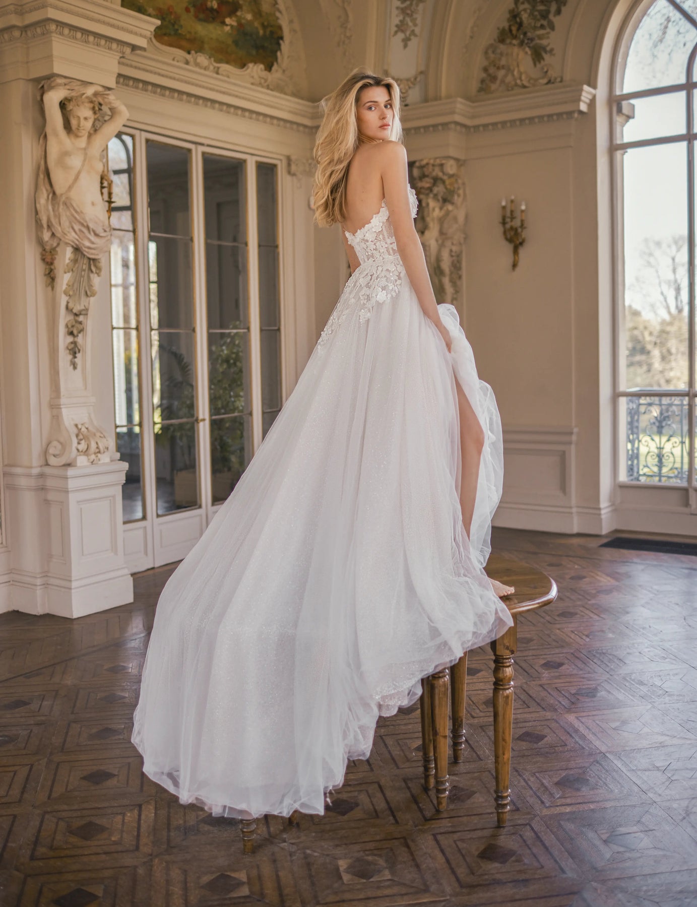 Netta BenShabu Morgana is a dreamy tulle A-line wedding dress featuring floral lace accents! Matching sleeves are included. This gown comes to us in great condition from a designer boutique. Please note, this designer runs small. Netta BenShabu Morgana is Ivory in color and a European size 42T, which fits like a US size 16.