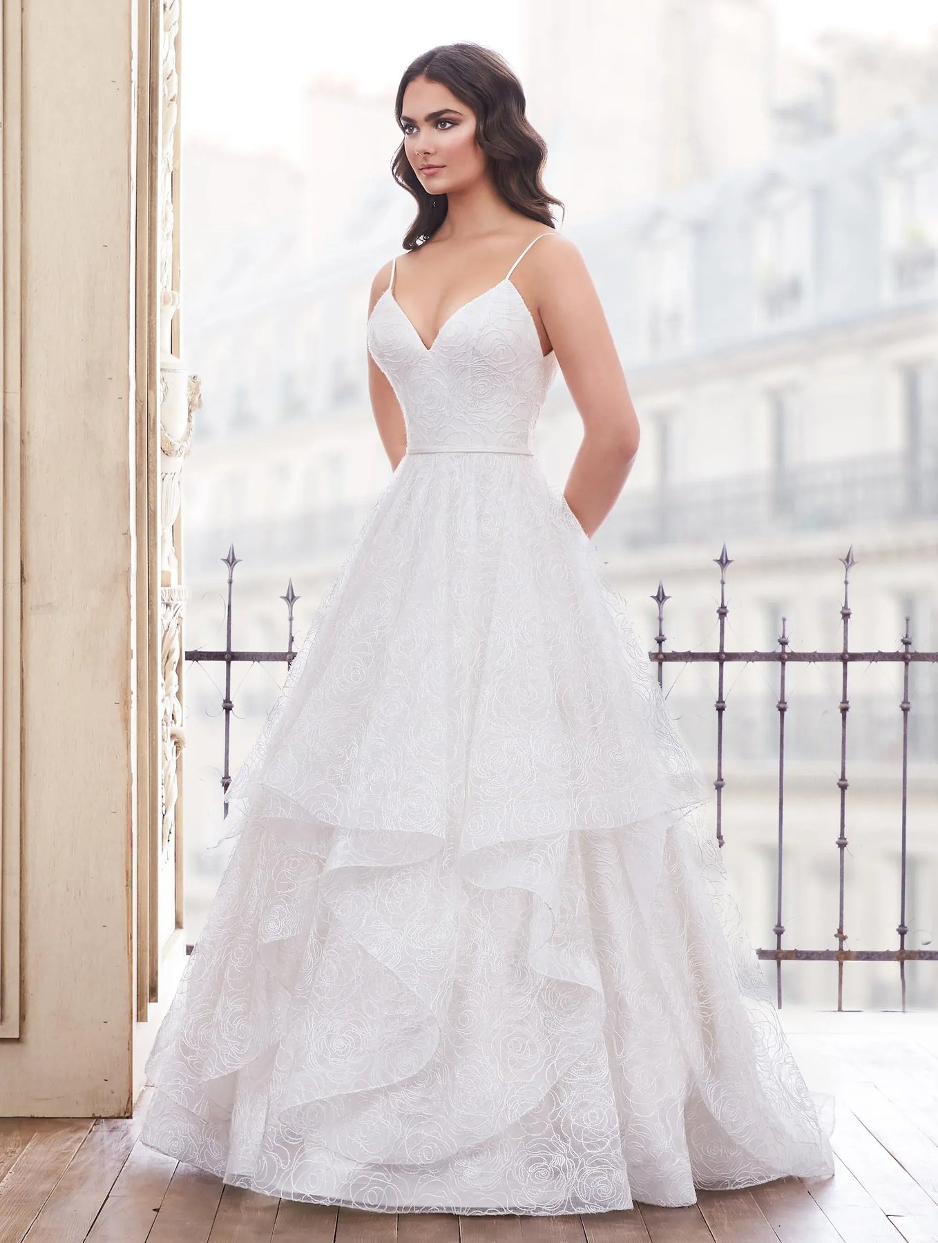 Paloma Blanca 4858 is a romantic tulle ball gown featuring a tiered skirt, with a floral print! This gown comes to us in great condition from a designer boutique. Paloma Blanca 4858 is Natural/Pearl in color and a size 10.