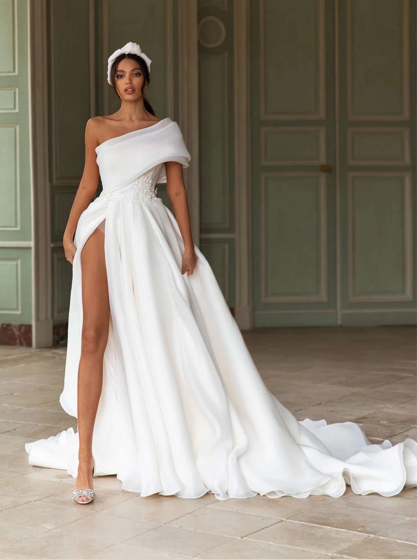 Pollardi Queenliness is a striking organza A-line wedding dress featuring a one-shoulder wrap! Please note, the bow pictured is NOT included. This gown comes to us in good condition from a designer boutique. The wrap need retacked. Pollardi Queenliness is Off White in color and a European size 48, which fits like a US size 16.