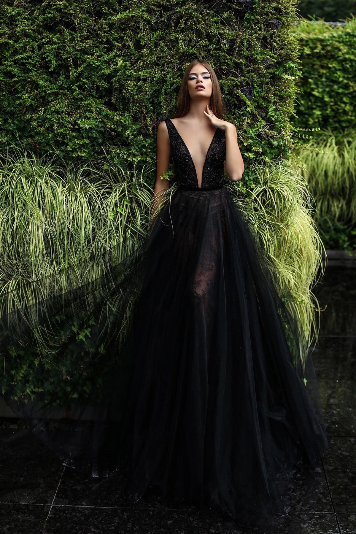 Pollardi Sirius is a moody tulle A-line wedding dress featuring a plunging V neckline + airy skirt! This gown comes to us in great condition from a designer boutique. Pollardi Sirius is Black/Nude in color and a size 12.