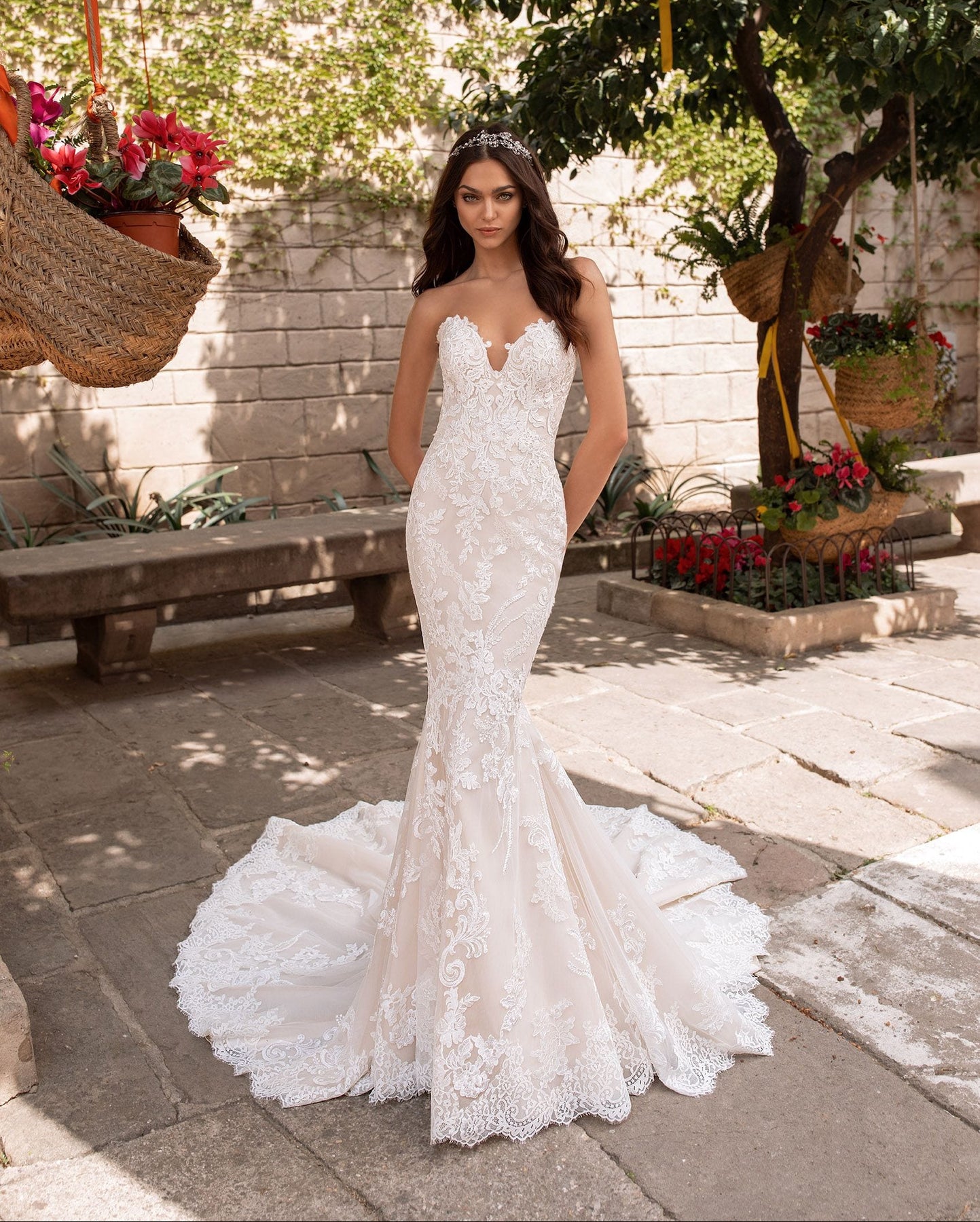Pronovias Aegir is a gorgeous lace fit and flare wedding dress! This look features a strapless sweetheart neckline + chapel-length train. This gown comes to us in good condition from a designer boutique. Pronovias Aegir is Off White/Crystal/Light Beige in color and a size 22.
