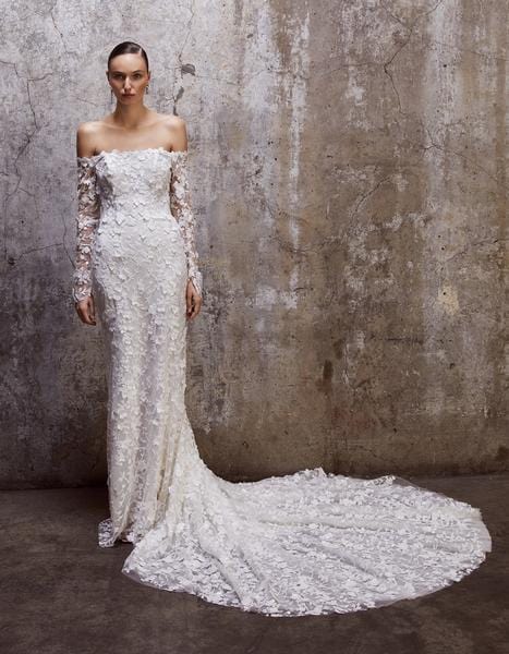 Rivini Brooke is a jaw-dropping wedding dress of three-dimensional beaded lace! Full-length sleeves accentuate the strapless bodice.