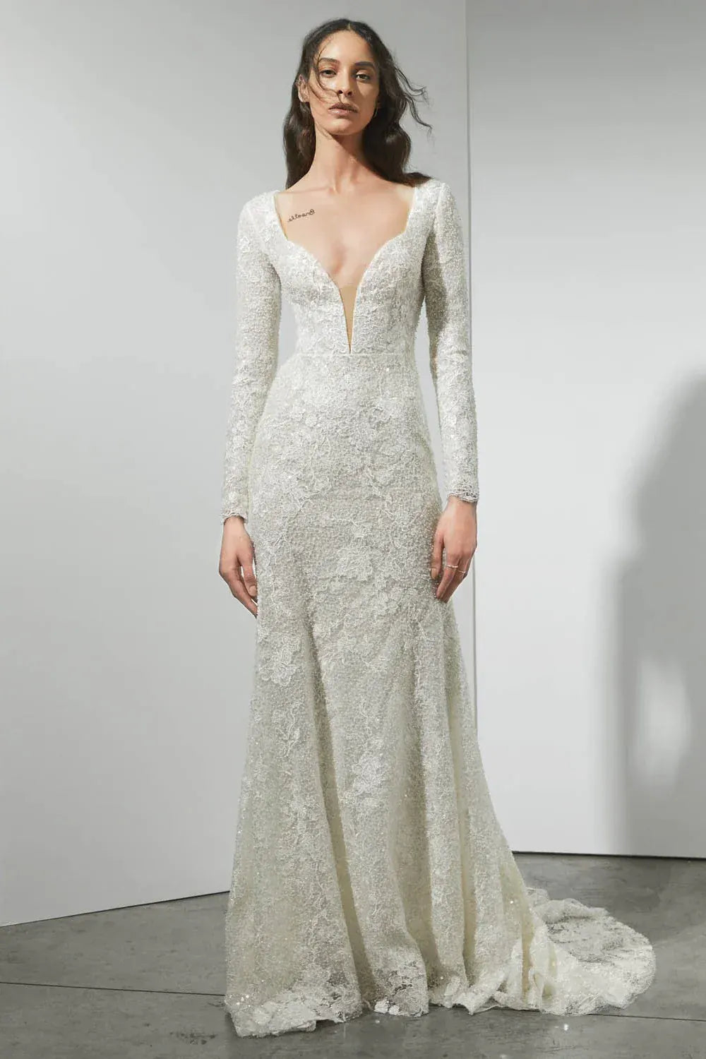 Rivini Jade is a luxurious lace sheath wedding dress featuring a deep V neckline + long sleeves! This gown comes to us in great condition from a designer boutique. Rivini Jade is Ivory in color and a size 12.