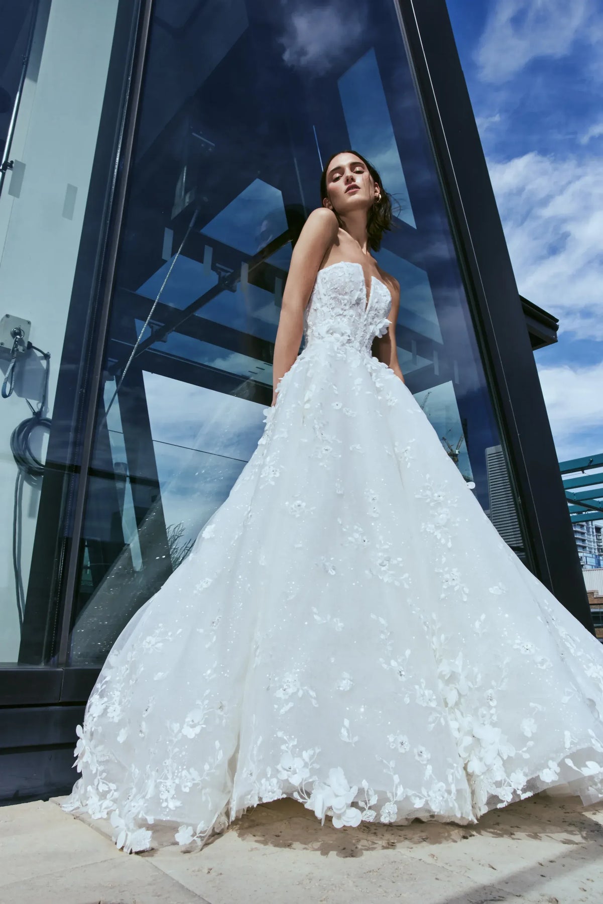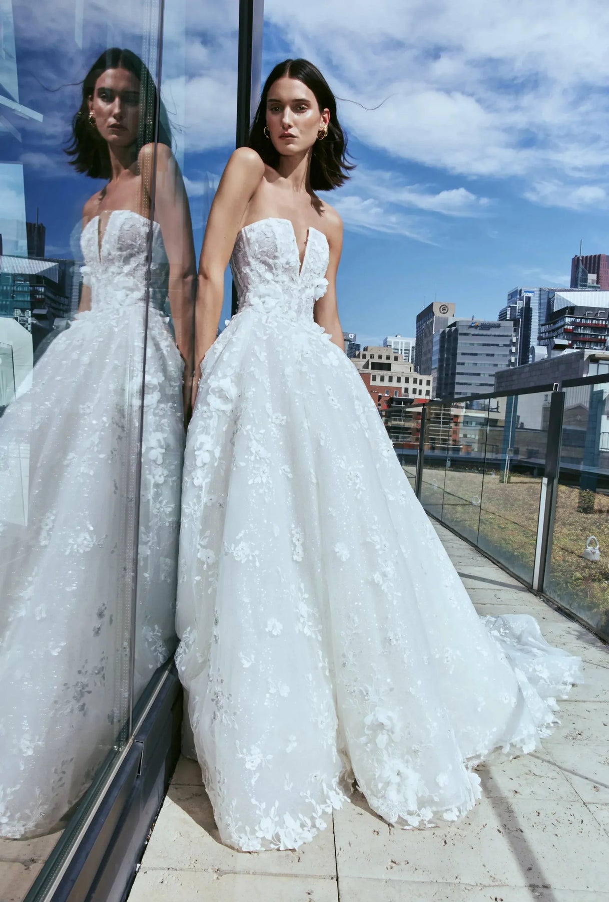 Rivini James is a stunning lace ball gown featuring a strapless neckline + dimensional florals! This gown comes to us in great condition from a designer boutique. Rivini James is Ivory in color and a size 14.