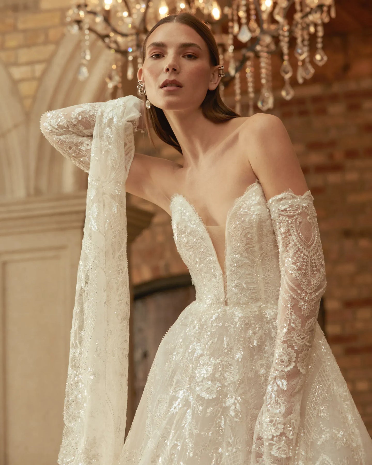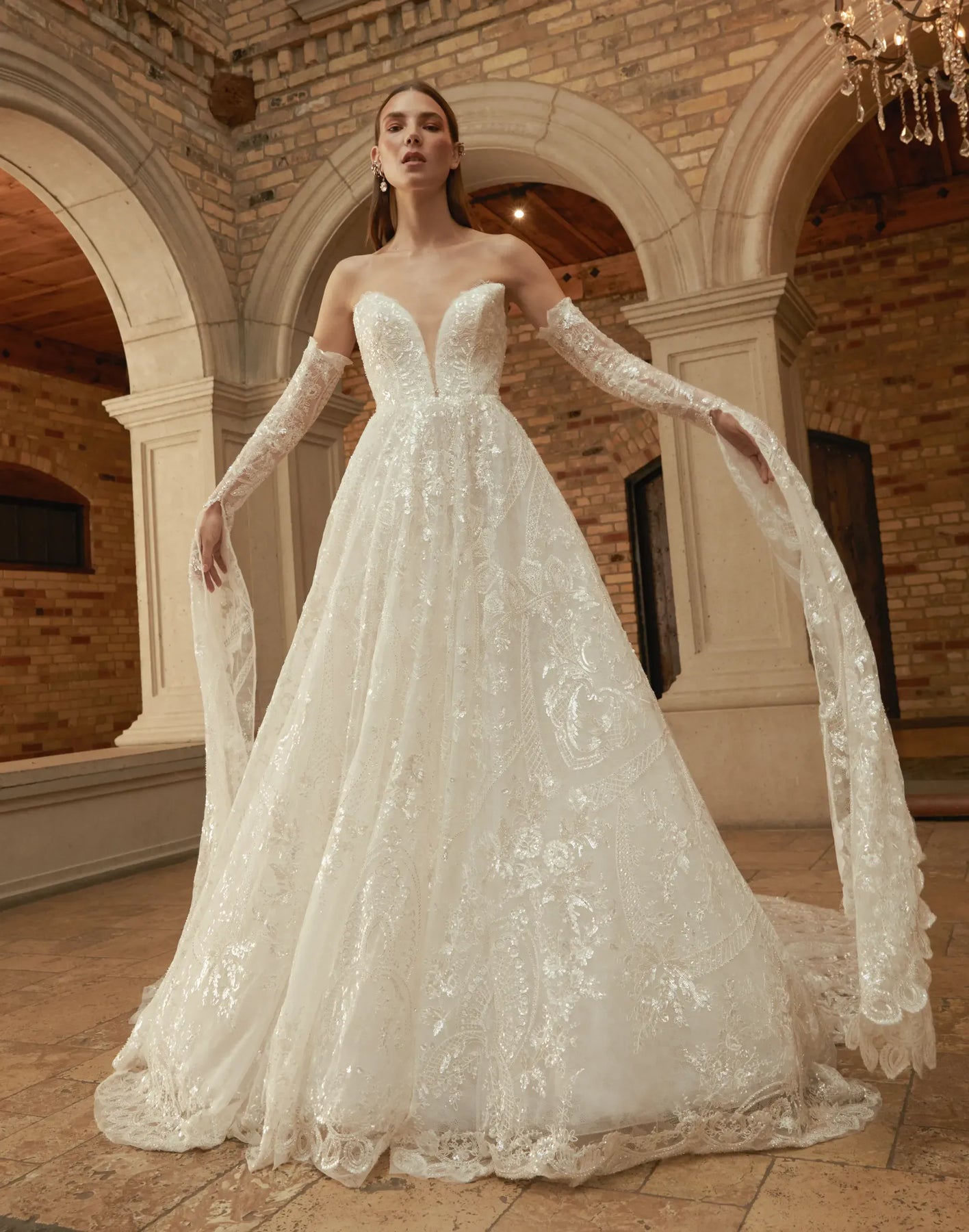 Rivini Tinsley is a beautiful lace ball gown featuring a sweetheart neckline + chapel-length train! Please note, the sleeves pictured are NOT included. This gown comes to us in great condition from a designer boutique. Rivini Tinsley is Ivory in color and a size 14.