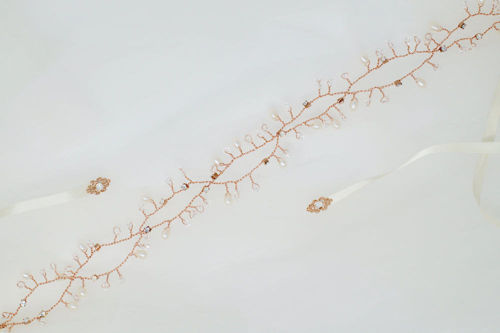 Sara Gabriel Roxanne Duet features an inter-woven metal vine accented with hand-wired sprigs of crystals and freshwater pearls! Sara Gabriel's "duets" can be tied in your hair, over your forehead, or around your waist for endless styling options.