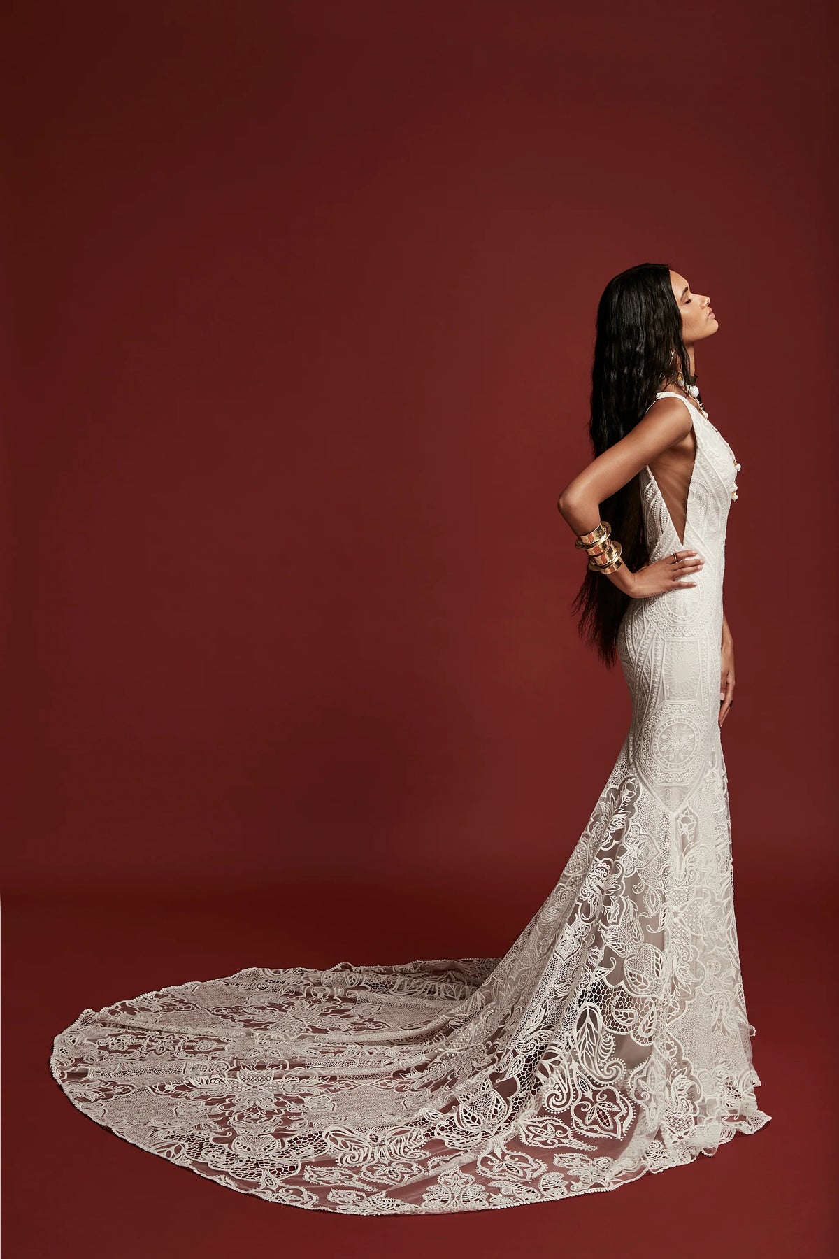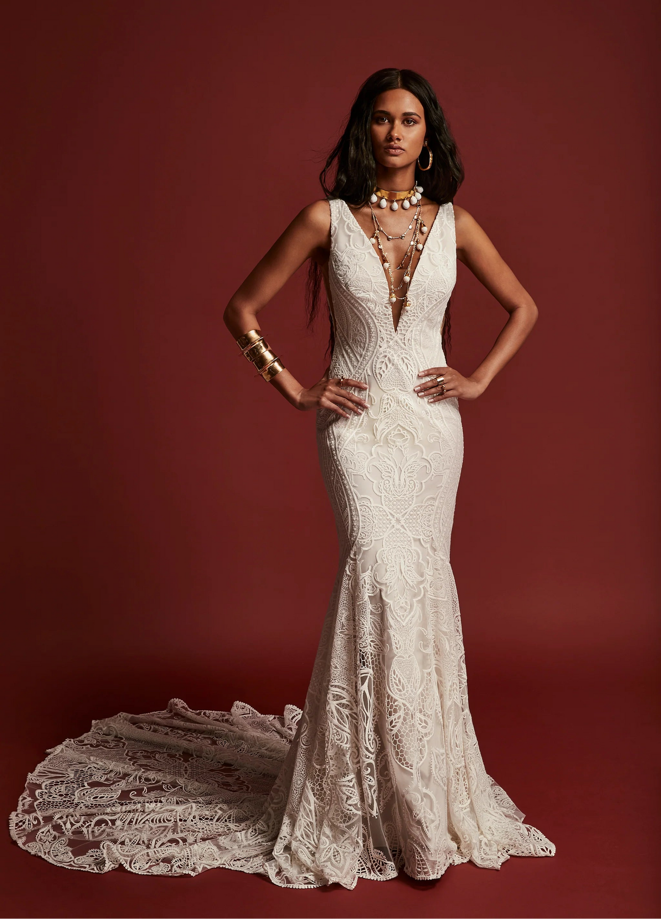 Rue De Seine Atlas is a beautiful lace fit and flare wedding dress featuring a bohemian lace pattern! This gown comes to us in good condition from a designer boutique. There is boutique dust + fraying on the hem. Rue De Seine Atlas is Off White in color and a UK size 12, which fits like a US size 8.