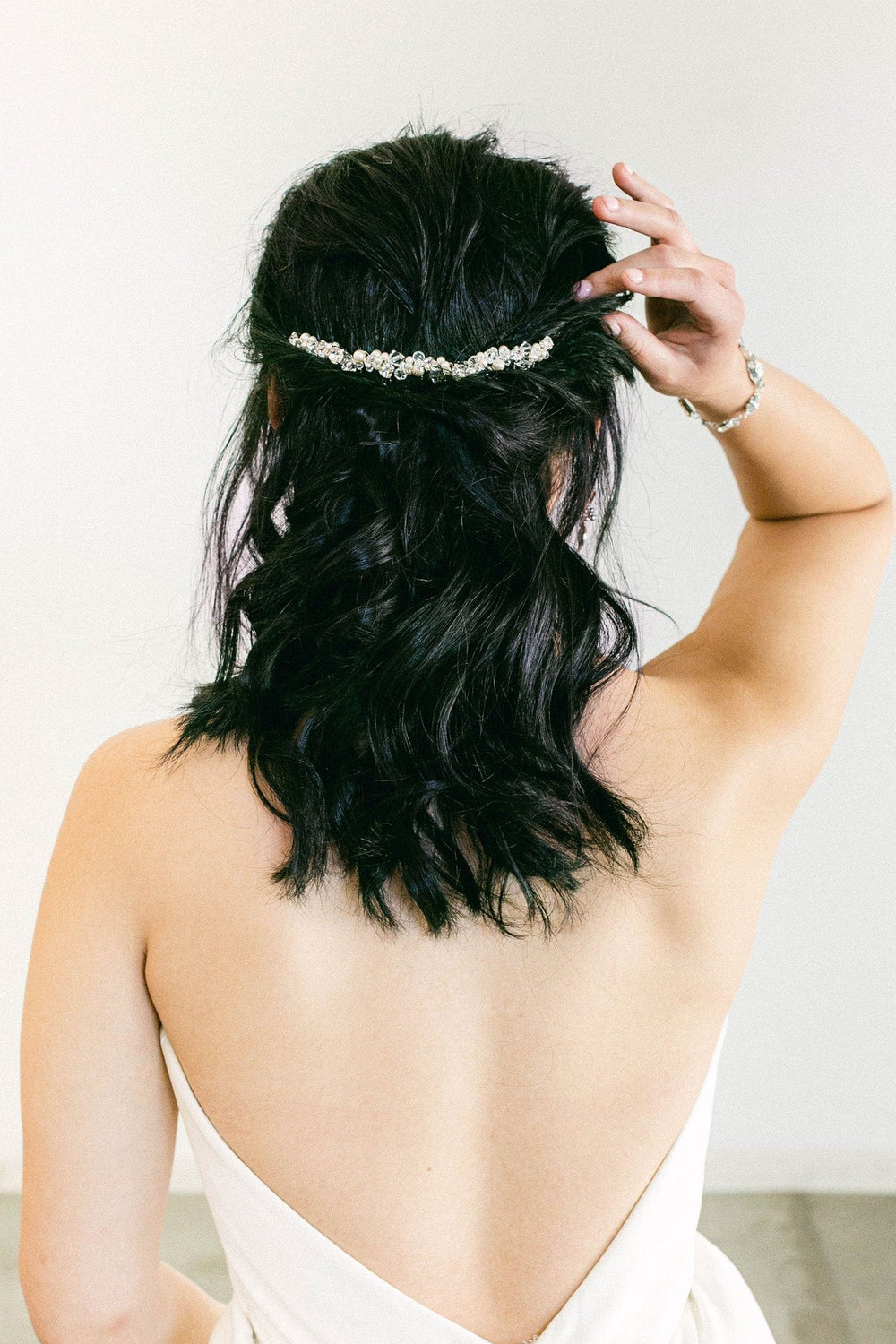 Sara Gabriel Gia Comb is an intricately hand-wrapped comb with shimmering crystals + pearls! You can style this piece up top for a headband look, slip into a side sweep, or tuck in with your veil for a pop of detail!