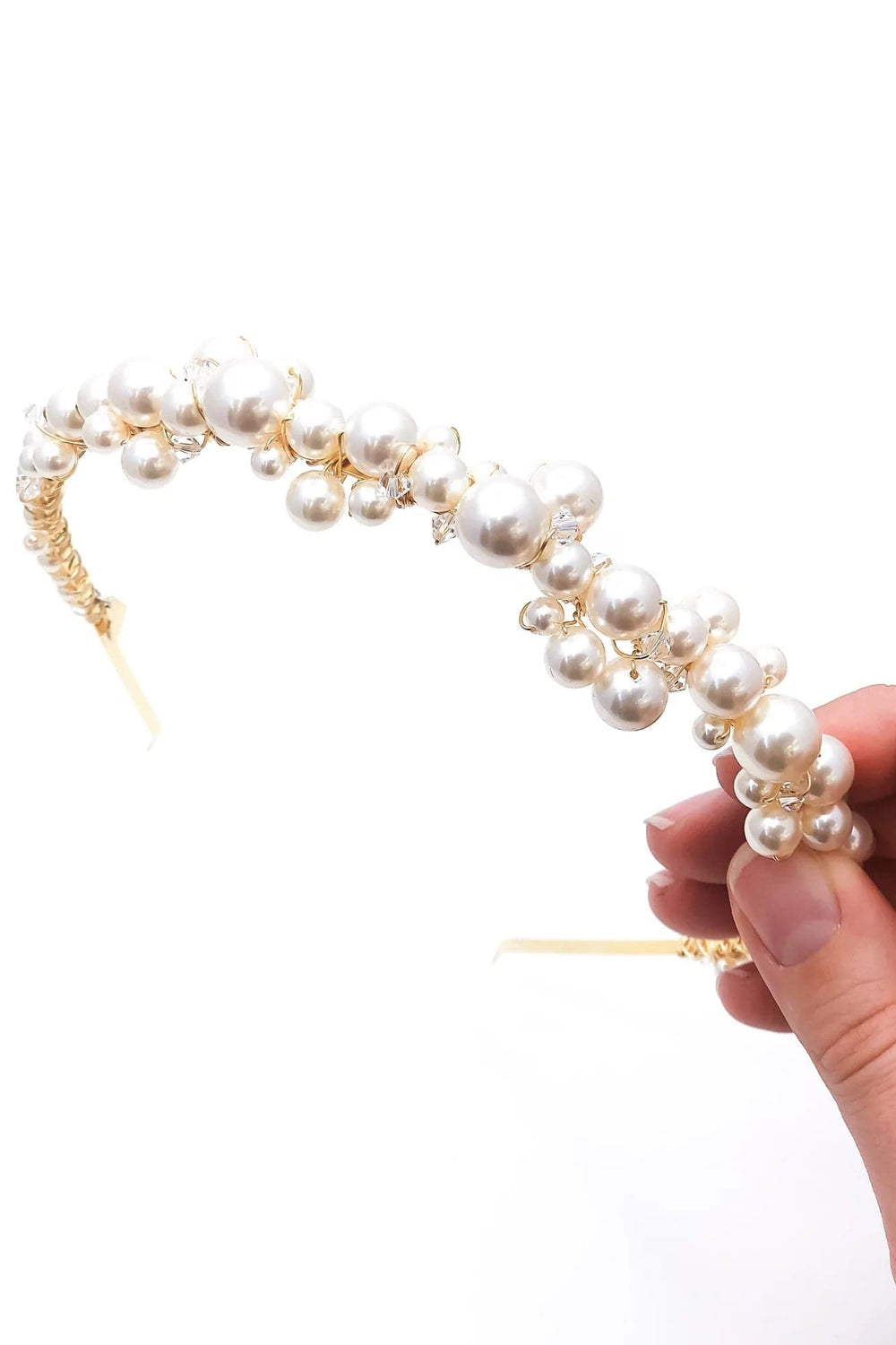 Sara Gabriel Luna Tiara is a bubble-pearled band wrapped with dozens of perfect pearls + crystals! Wear up top for a tiara moment, or simply as a classic headband.