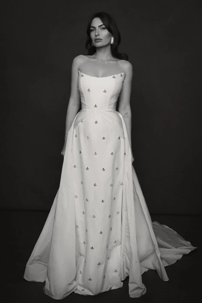 Sarah Seven Diamond is a stunning taffeta A-line wedding dress accented with beading throughout! This gown comes to us in great condition from a designer boutique. Sarah Seven Diamond is Light Ivory in color and a size 12.