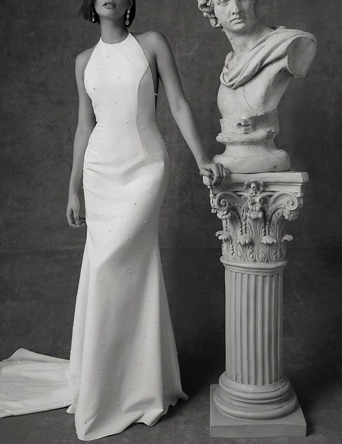 Sarah Seven Guiliana is a modern crepe fit and flare wedding dress featuring a halter neckline, open back, + pearl-embellishments! This gown comes to us in good condition from a designer boutique. There are loose threads, missing pearls, + spots on the front. Sarah Seven Guiliana is Ivory in color and a size 4.