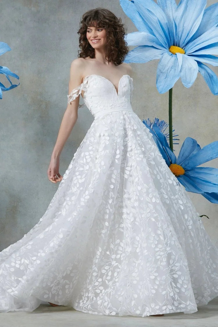 Savin London Hollie is a graceful tulle A-line wedding dress featuring dimensional leafy floral accents! This gown comes to us in great condition from a designer boutique. Savin London Hollie is Ivory in color and a size 18.