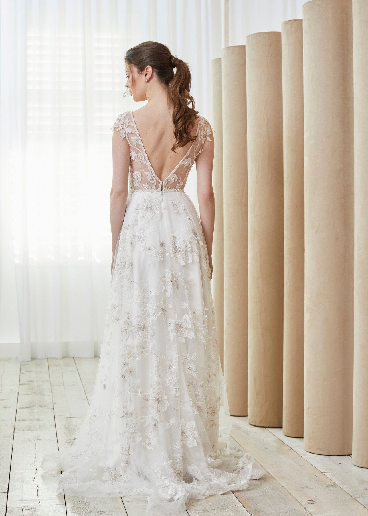 Savin London Isabella is a totally romantic A-line gown featuring three-dimensional florals from head to toe! This gown comes to us in good condition from a designer boutique. There is some loose beading on the back. Savin London Isabella is Ivory in color and a UK size 12, which fits like a US size 8.