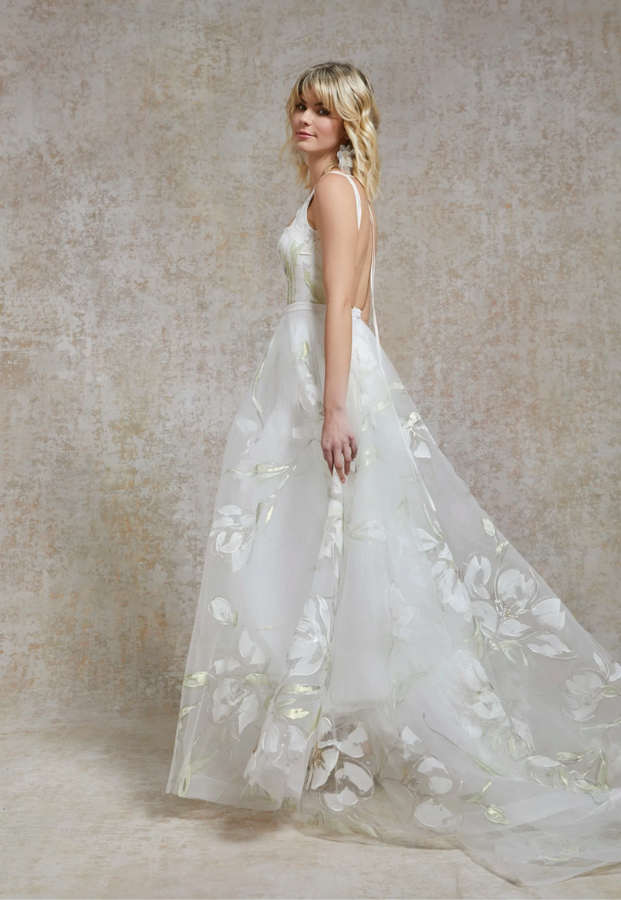 Savin London Julia is an ethereal tulle A-line wedding dress featuring hand-painted flowers! This gown comes to us in great condition from a designer boutique. The back of our gown was raised three inches to remove the tie. Savin London Julia is Ivory/Pastel Green in color and a UK size 14, which fits like a US size 10.