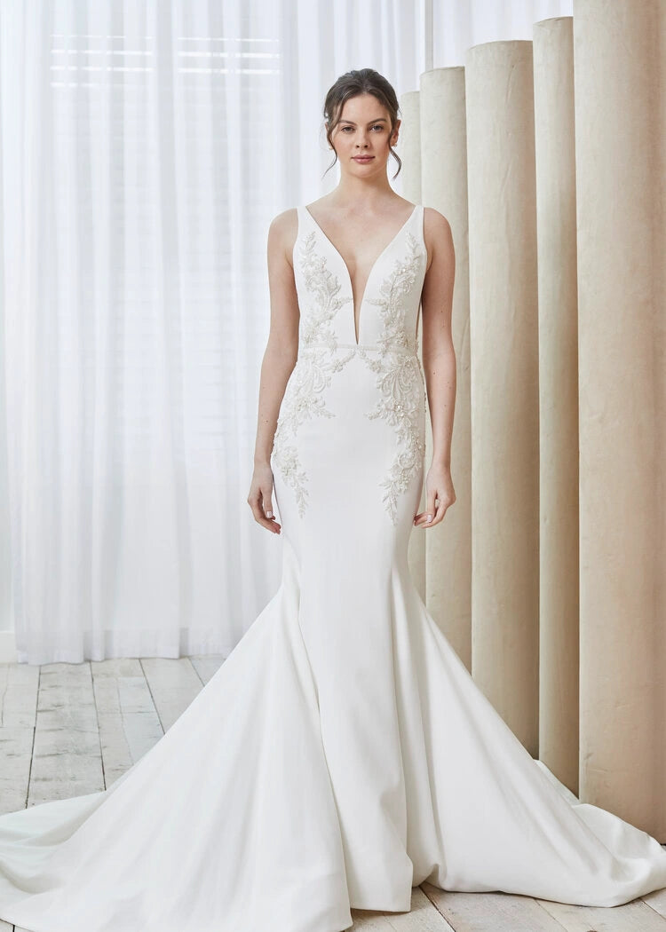 Savin London Zara is a gorgeous crepe fit and flare wedding dress featuring beaded floral accents on the bodice! This gown comes to us in fair condition from a designer boutique. The eye needs replaced, + there are spots on the straps + train/underskirt. Savin London Zara is Ivory in color and a UK size 20, which fits like a US size 16.