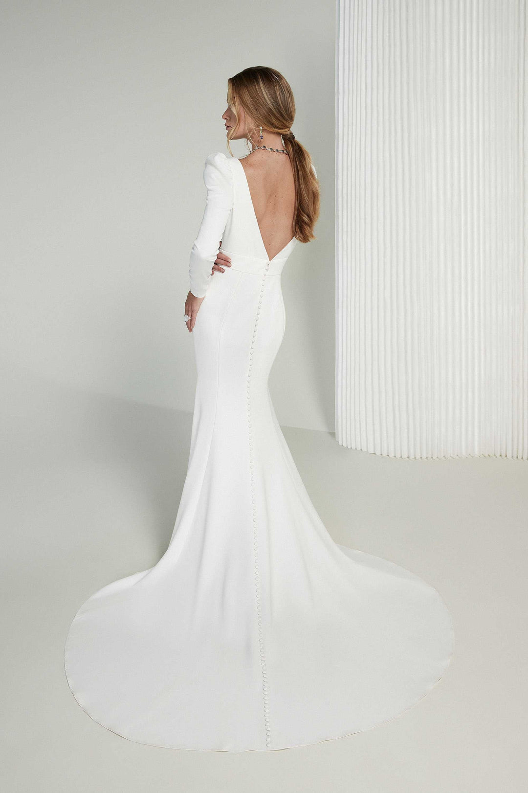 Signature by Justin Alexander Celine is a glamorous crepe fit and flare wedding dress! This sultry silhouette features a deep V neckline, long sleeves with puffed shoulders, + a chapel-length train.