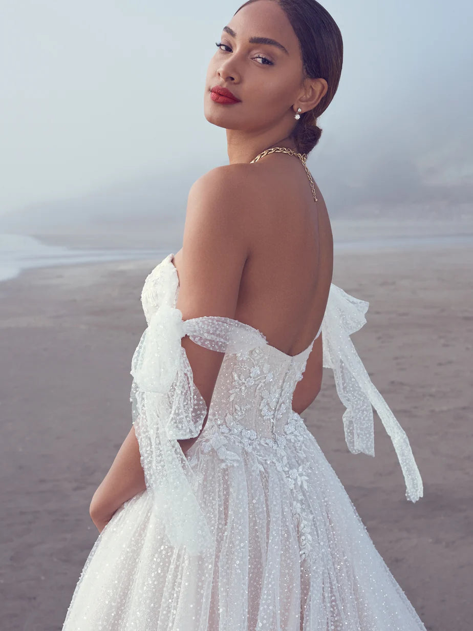 Sottero and Midgley Shasta is a dreamy sparkle tulle ball gown featuring detachable straps that add bow accents! This gown comes to us in good condition from a designer boutique. There is a loose eye + button, + loose threads + a snap on the straps. Sottero and Midgley Shasta is Diamond White in color and a size 12.