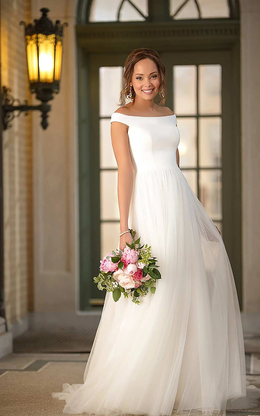 Stella York 7023 is a lovely tulle A-line wedding dress! The bodice has a modest, off the shoulder neckline, crafted from crepe. This gown comes to us in great condition from a designer boutique. Stella York 7023 is Ivory in color and a size 14.