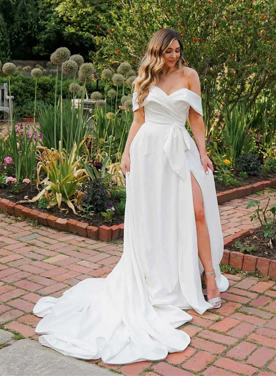 Stella York 7644 is a modern crepe A-line wedding dress! This look has an off-the-shoulder neckline + slit in the skirt. This gown comes to us in good condition from a designer boutique. Spot cleaning is needed for spots throughout. Stella York 7644 is Ivory in color and a size 14.
